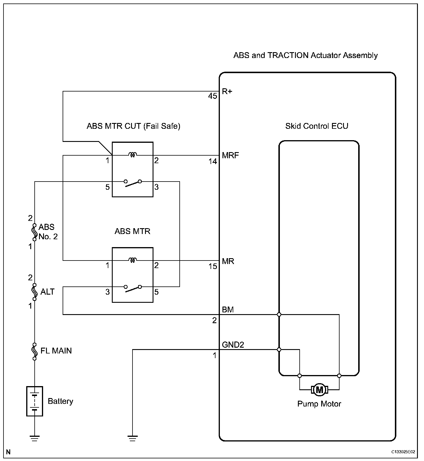 - While any of the ABS, BA, TRAC and VSC is operating, the skid control ECU (included in the ABS and TRACTION actuator) turns the ABS MTR relay on to operate the actuator pump motor.