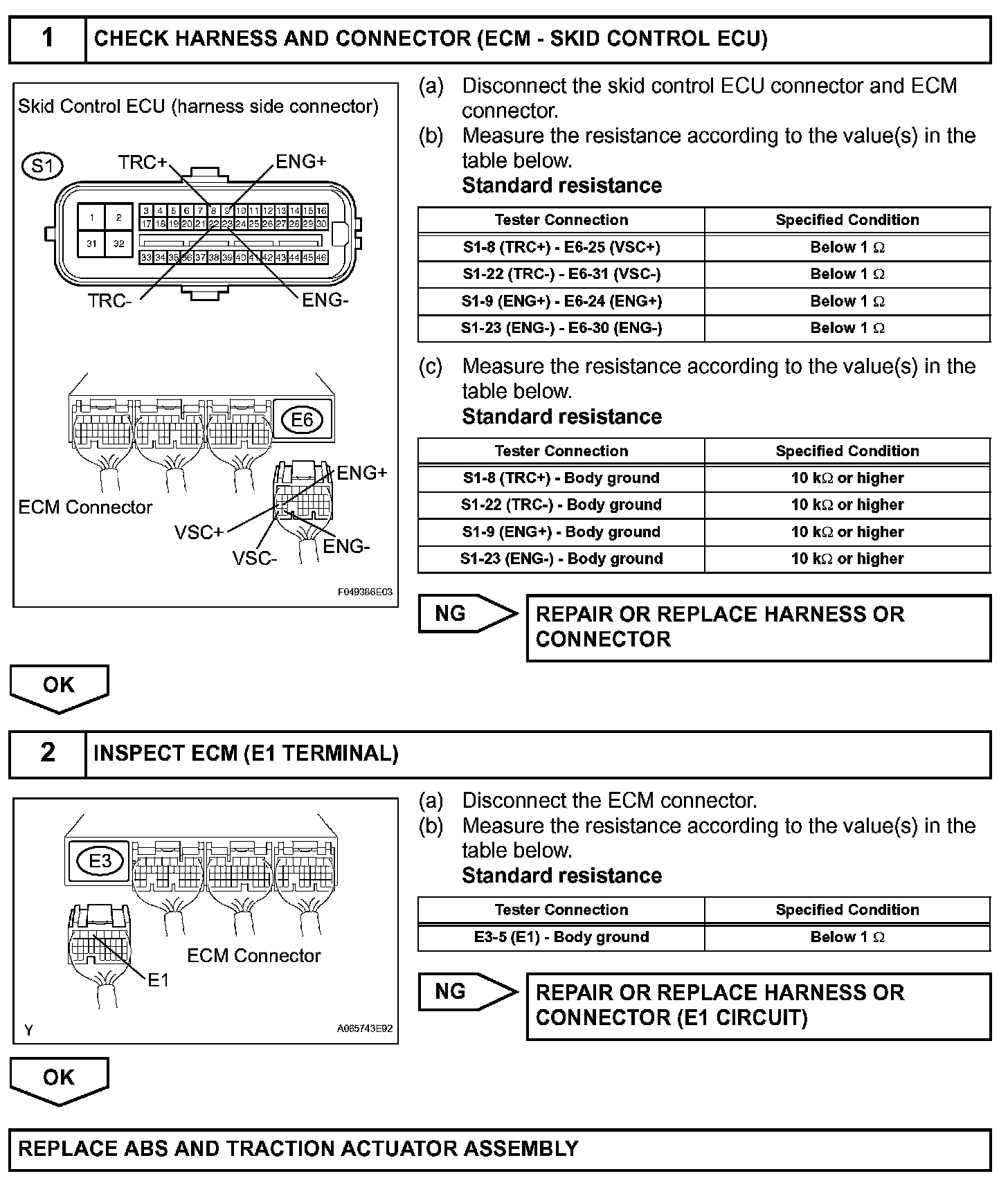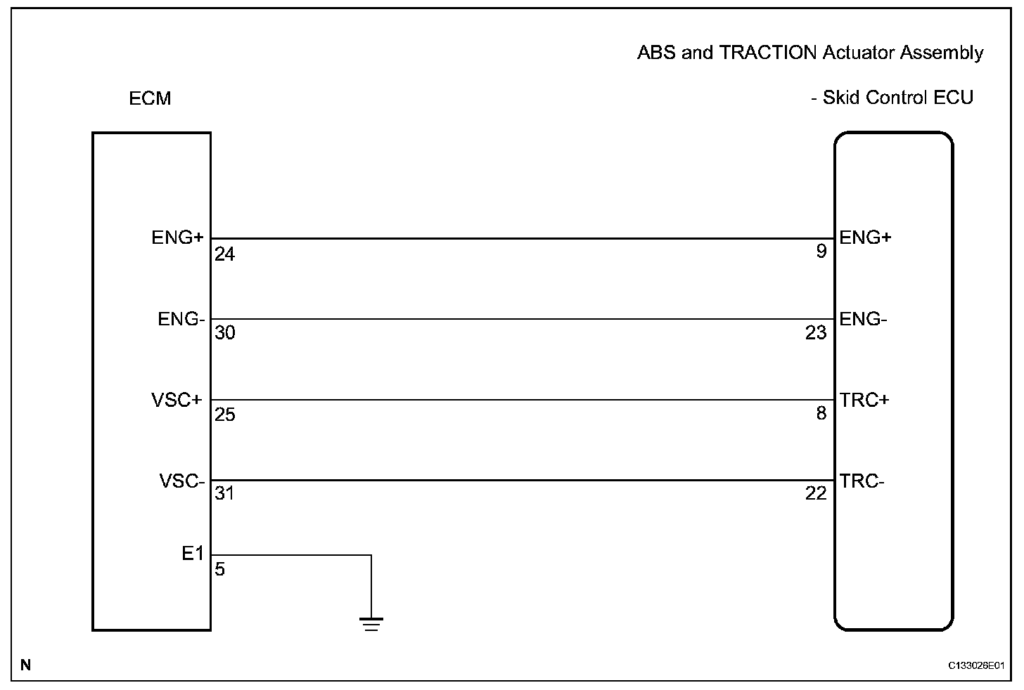 The circuit is used to send TRAC and VSC control information (engine revolution signal) from the skid control ECU to the ECM (TRC+, TRC-), and engine control information from the ECM to the skid control ECU (ENG+, ENG-).