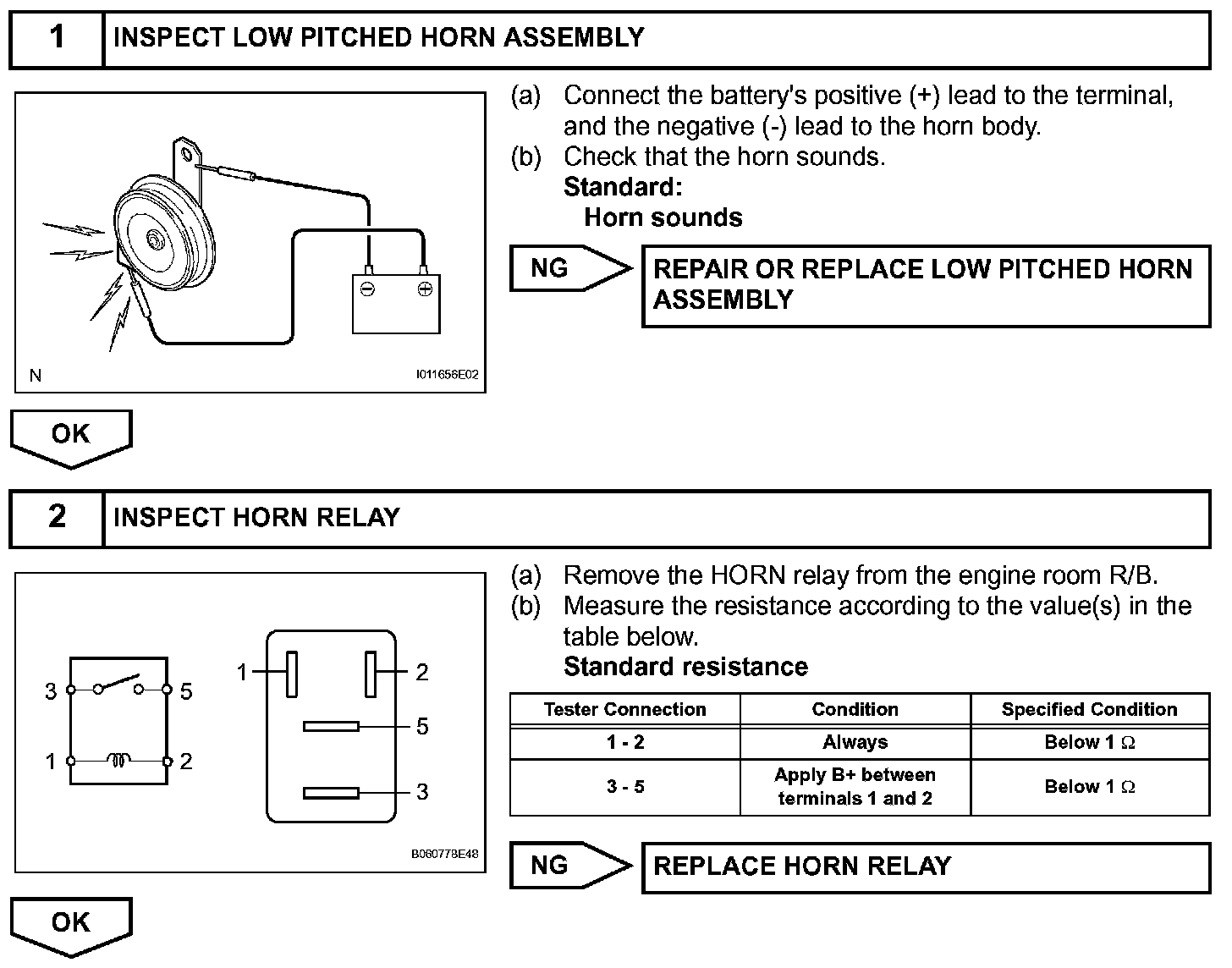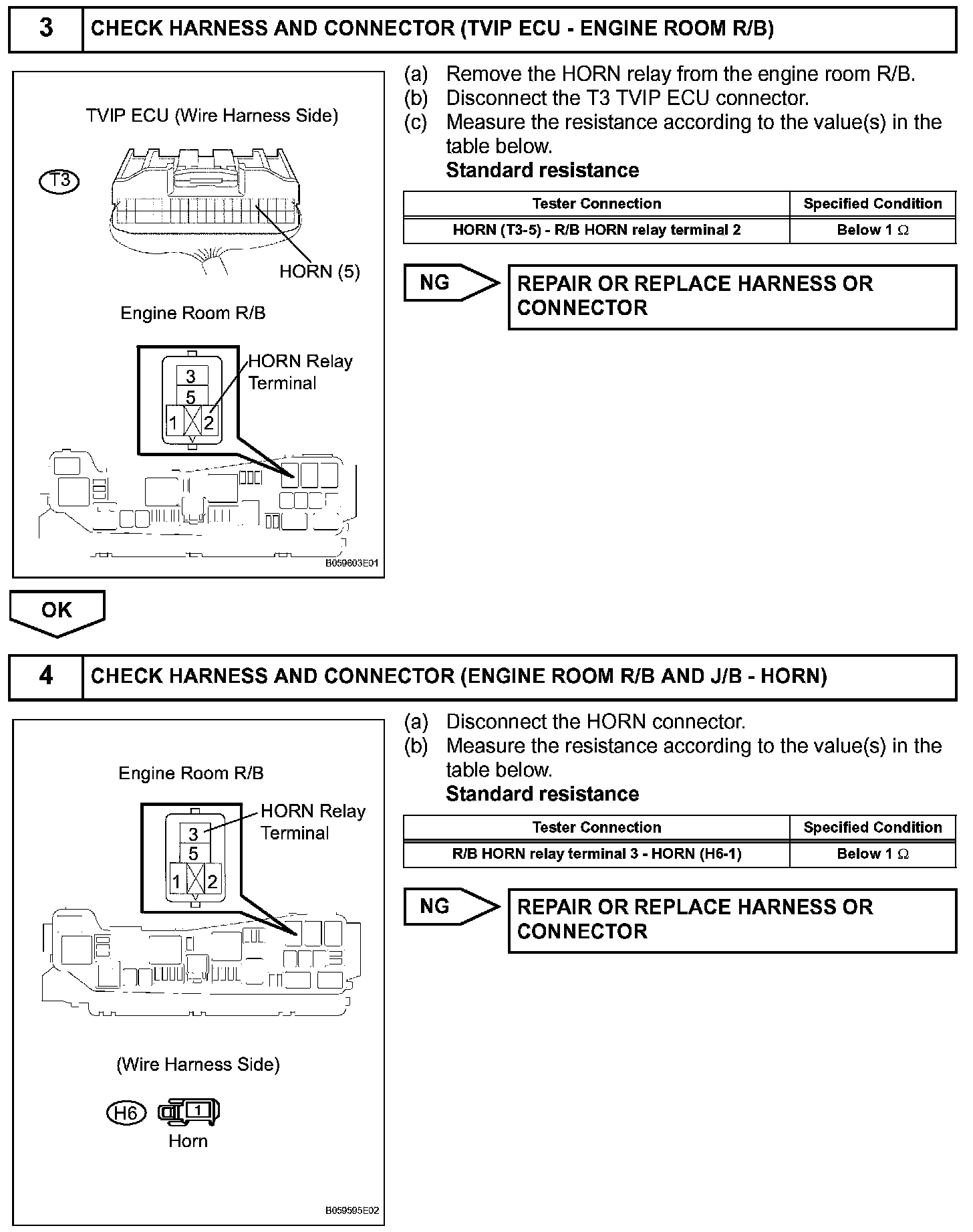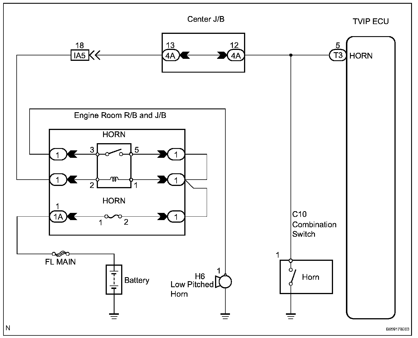 When the TVIP system changes from the armed state to the alarm sounding state, the TVIP ECU turns on the HORN relay so that it can standard the horns. The horn cycles between cycles between ON and OFF at intervals of 0.4 seconds.