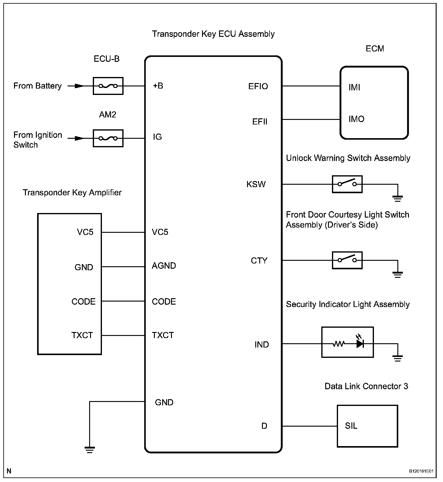 a. When the transponder key ECU assembly detects that the key unlock warning switch is ON, the ECU provides current to the transponder key coil and produces a faint electric wave. A transponder chip in the key grip receives the faint electric wave. Upon receiving the faint electric wave, the transponder chip outputs a key ID code signal. The transponder key coil receives this signal, the transponder key amplifier amplifies it, and then the signal is transmitted to the ECU.