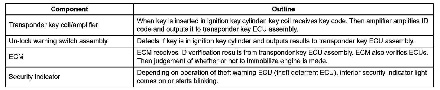 The engine immobilizer system is designed to prevent the vehicle from being stolen. This system uses a transponder key ECU assembly that stores the key codes of authorized ignition keys. If an attempt is made to start the engine using an unauthorized key, the ECU sends a signal to the ECM to prohibit fuel delivery and ignition, effectively disabling the engine.