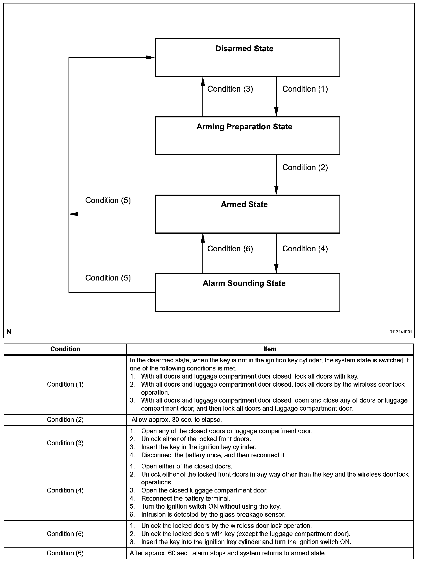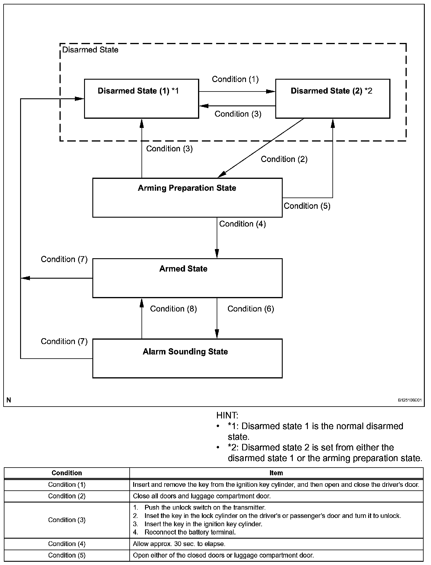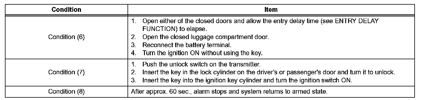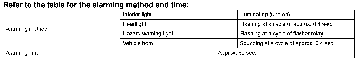 HINT: If closing all doors and lock them with a key or wireless operation in the passive mode, the system functions in active mode. If the state is changed into the disarmed state, the system returns to the passive mode.