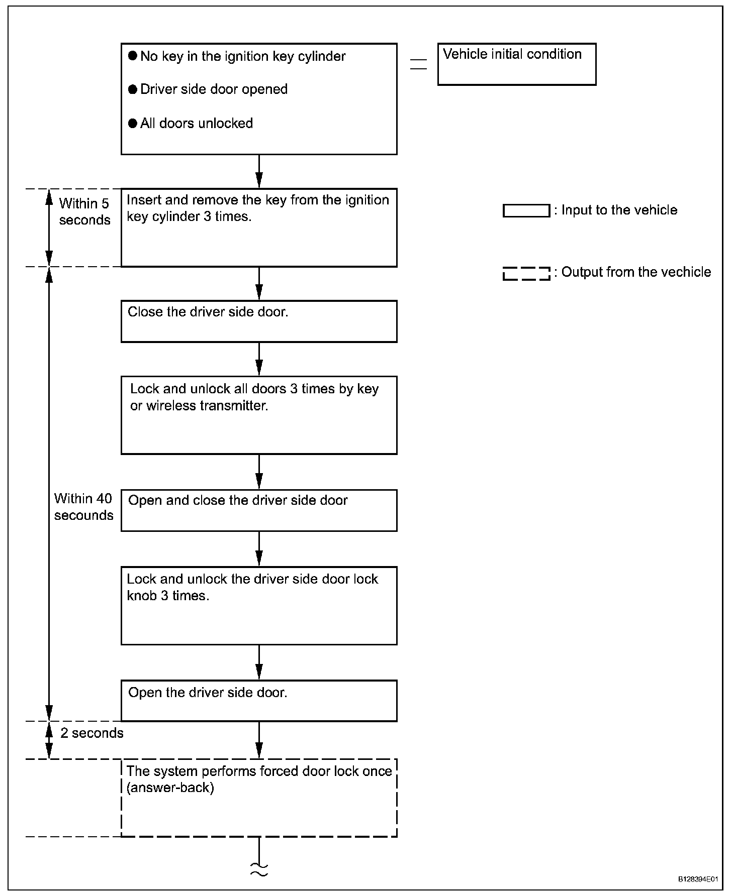 a. The forced door lock control prevents the vehicle from being tampered with. Immediately after a door is unlocked (alarm starts), the door is forced to lock by a forced door lock signal.