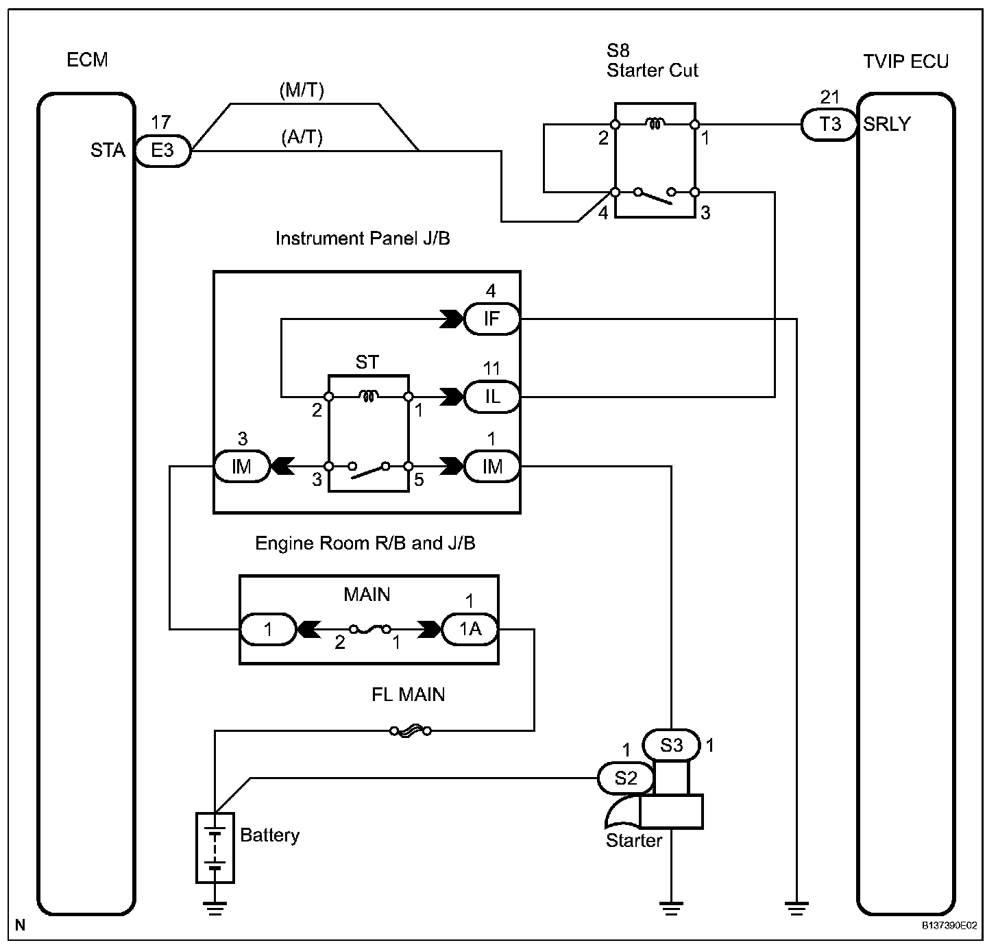 When the TVIP system is activated, the TVIP ECU does not allow the stater cut relay to turn on. As a result, the starter cannot crank the engine.