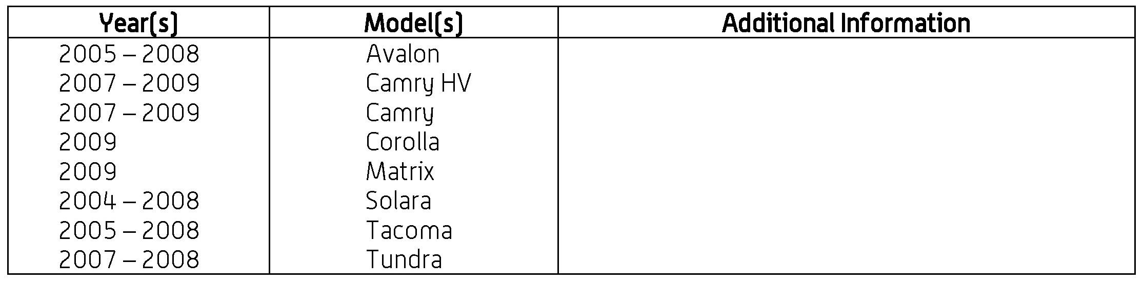 '05 - '08 Avalon, '07 - '09 Camry HV, '07 - '09 Camry, Corolla, Matrix, '04 - '08 Solara, '05 - '08 Tacoma, '07 - '08 Tundra