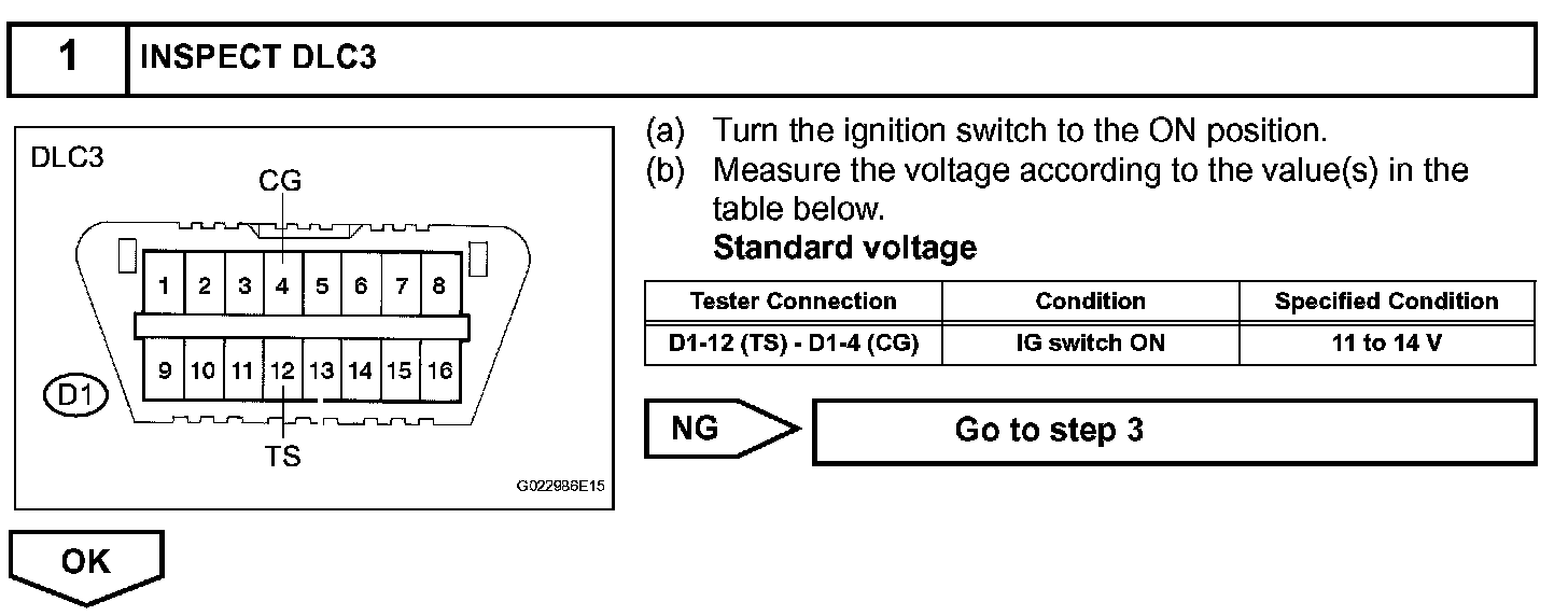 Transition to the sensor check mode can be performed by connecting terminals TS and CG of the DLC3 and turning the ignition switch from off to the ON position.