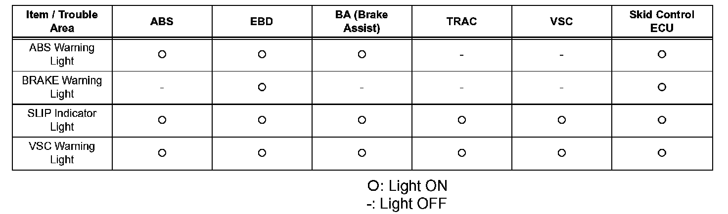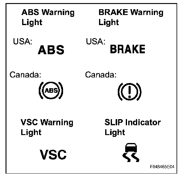 If the skid control ECU detects a malfunction, the ABS, BRAKE, VSC warning lights and SLIP indicator light will come on to warn the driver.