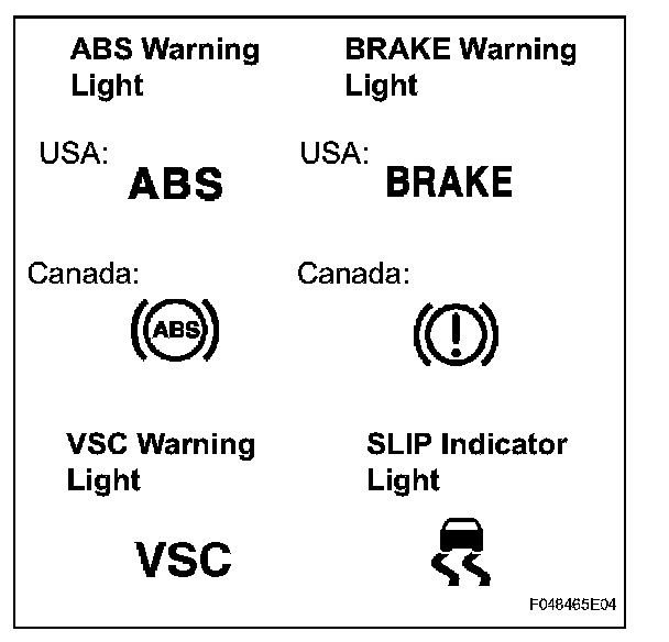 b. When the ignition switch is turned to the ON position, check that the ABS warning light, VSC warning light, BRAKE warning light and SLIP indicator light come on for approximately 3 seconds.