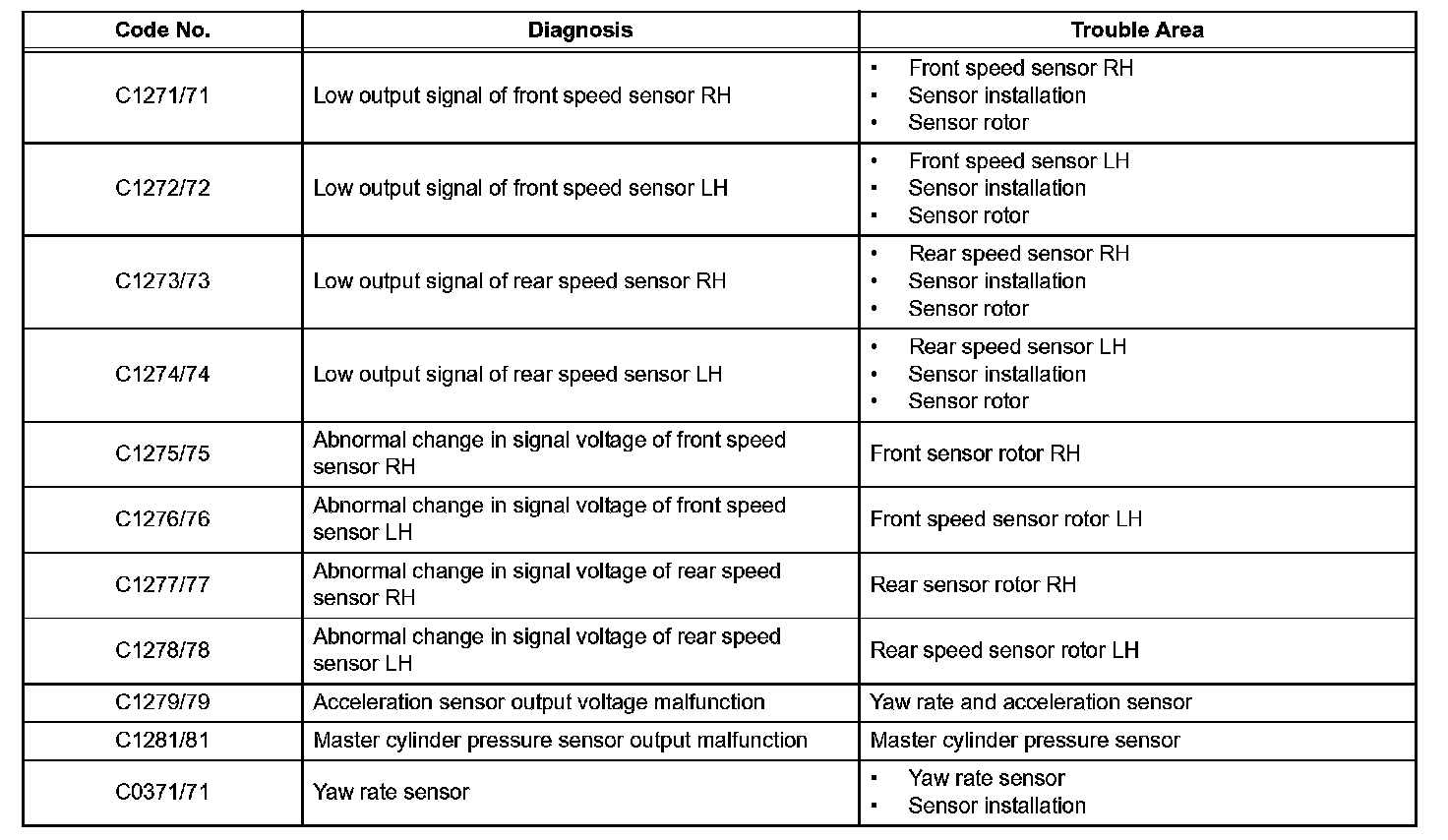 HINT: The codes in this table are output only in SIGNAL CHECK (TEST MODE).