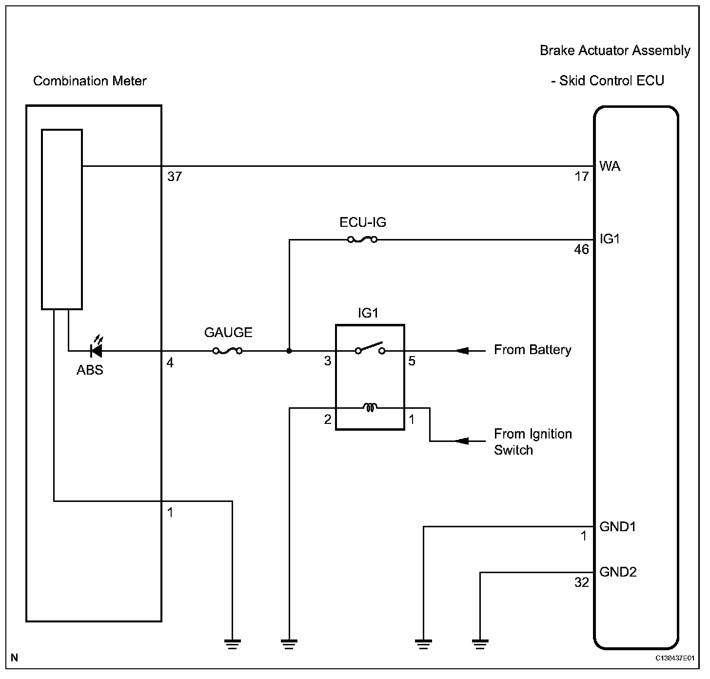 c. There is an open in the wire harness between the combination meter and skid control ECU.