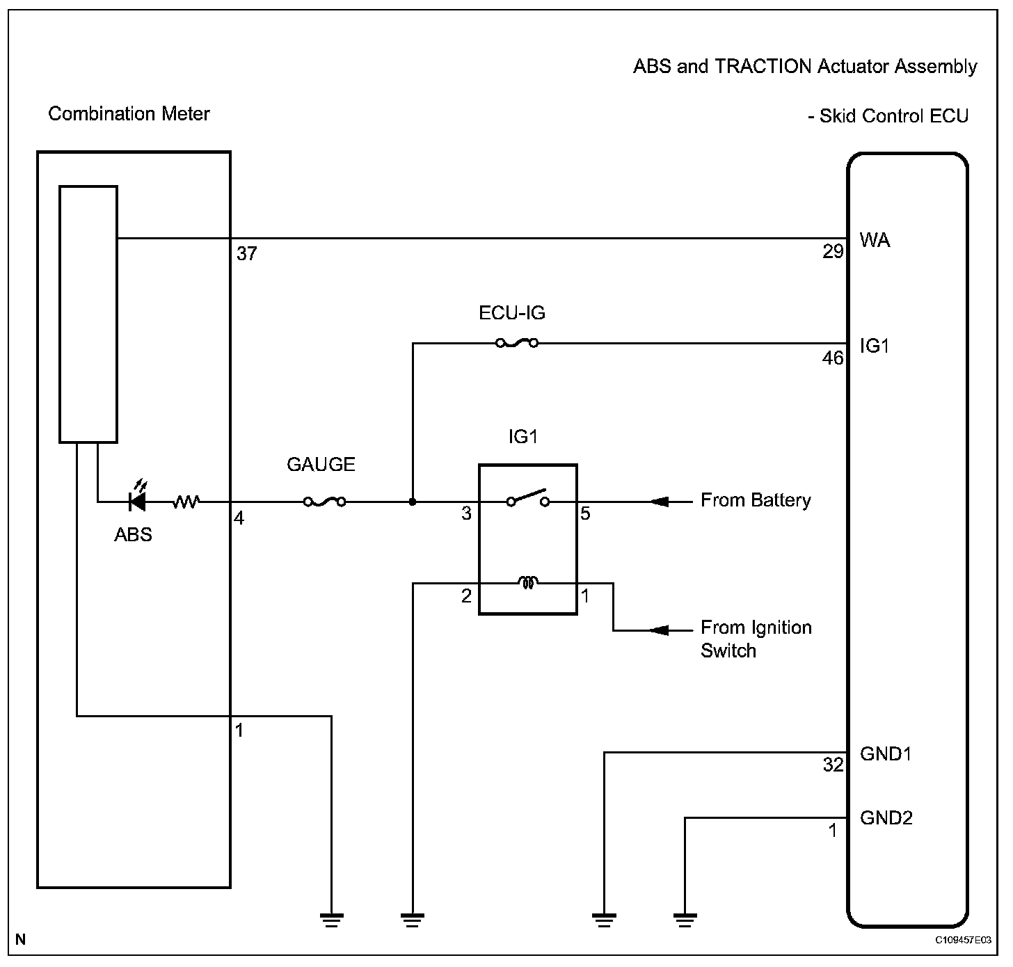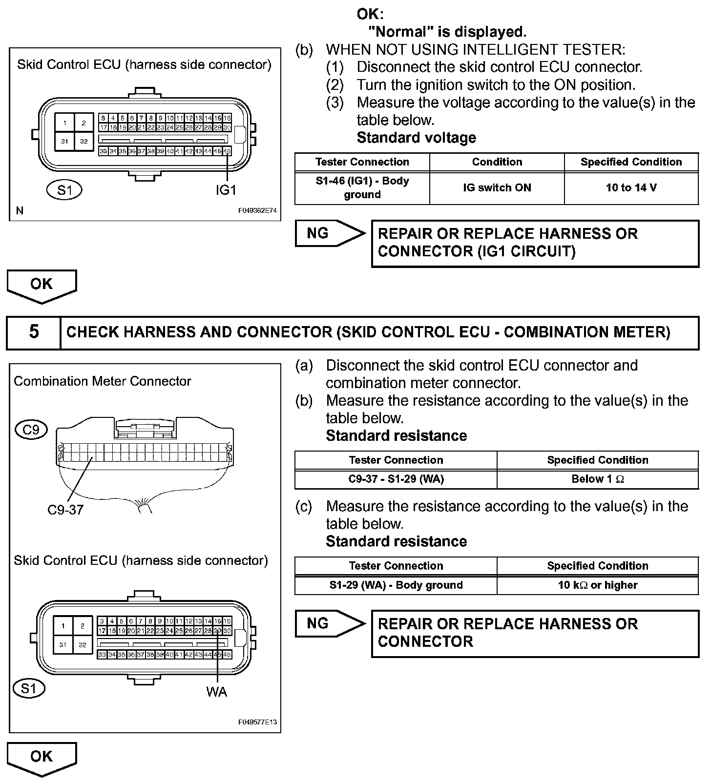 c. There is an open in the wire harness between the combination meter and skid control ECU.