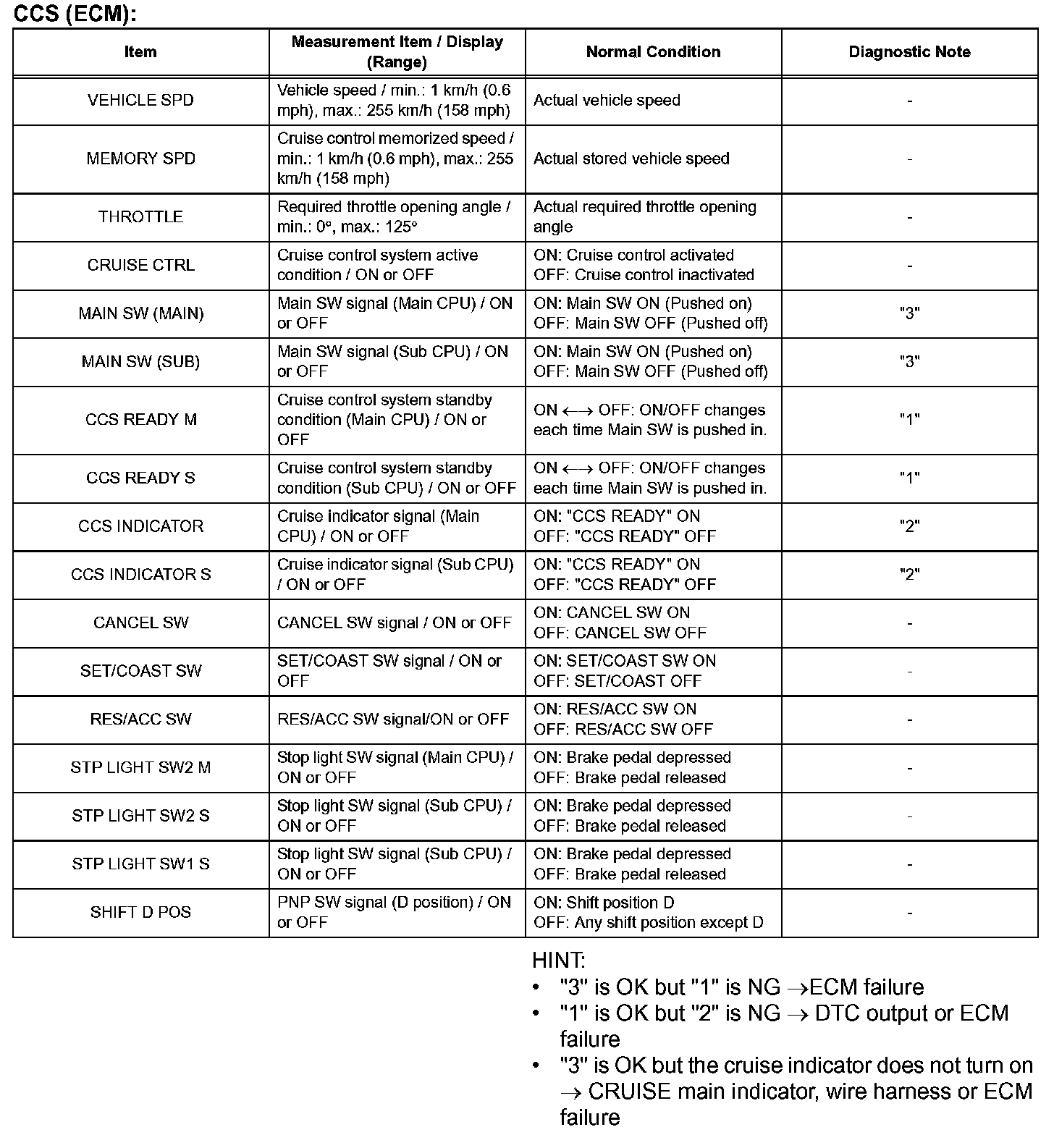 While the intelligent tester is connected to the DLC3 with the ignition switch in the ON position, the CRUISE CONTROL data list can be displayed. Follow the prompts on the tester screen to access the data list.