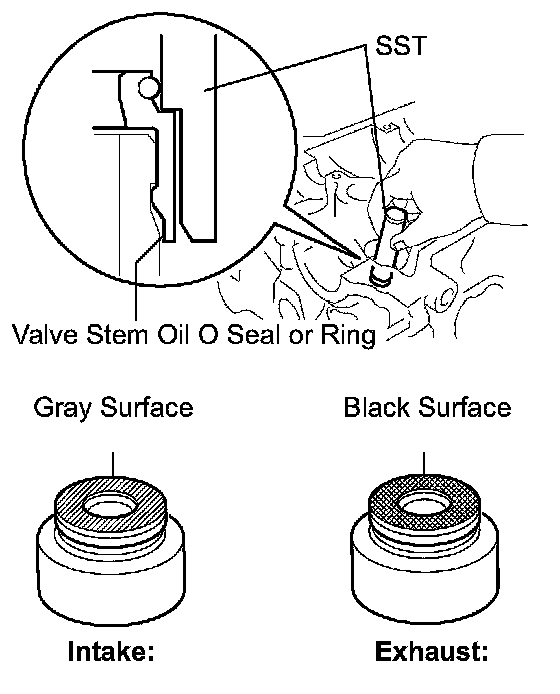HINT: The intake valve stem oil seal is gray and exhaust valve stem oil seal is black.