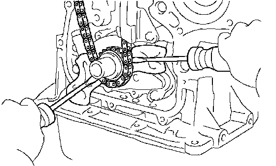 (a) Using 2 screwdrivers, pry out the chain with the crankshaft timing gear, as shown in the illustration.