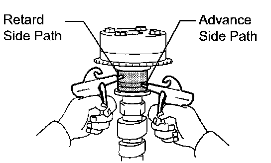 HINT: Two advance side paths are provided in the groove of the camshaft. Plug one of the paths with a piece of rubber.