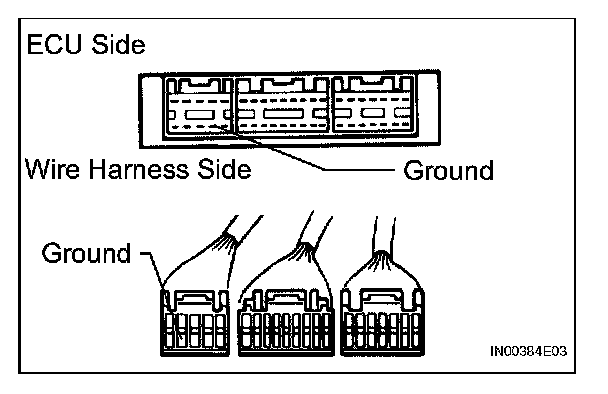 2. Disconnect the ECU connector. Check the ground terminal on the ECU side and wire harness side for bending, corrosion or foreign matter. Lastly, check the contact pressure of the female terminals.