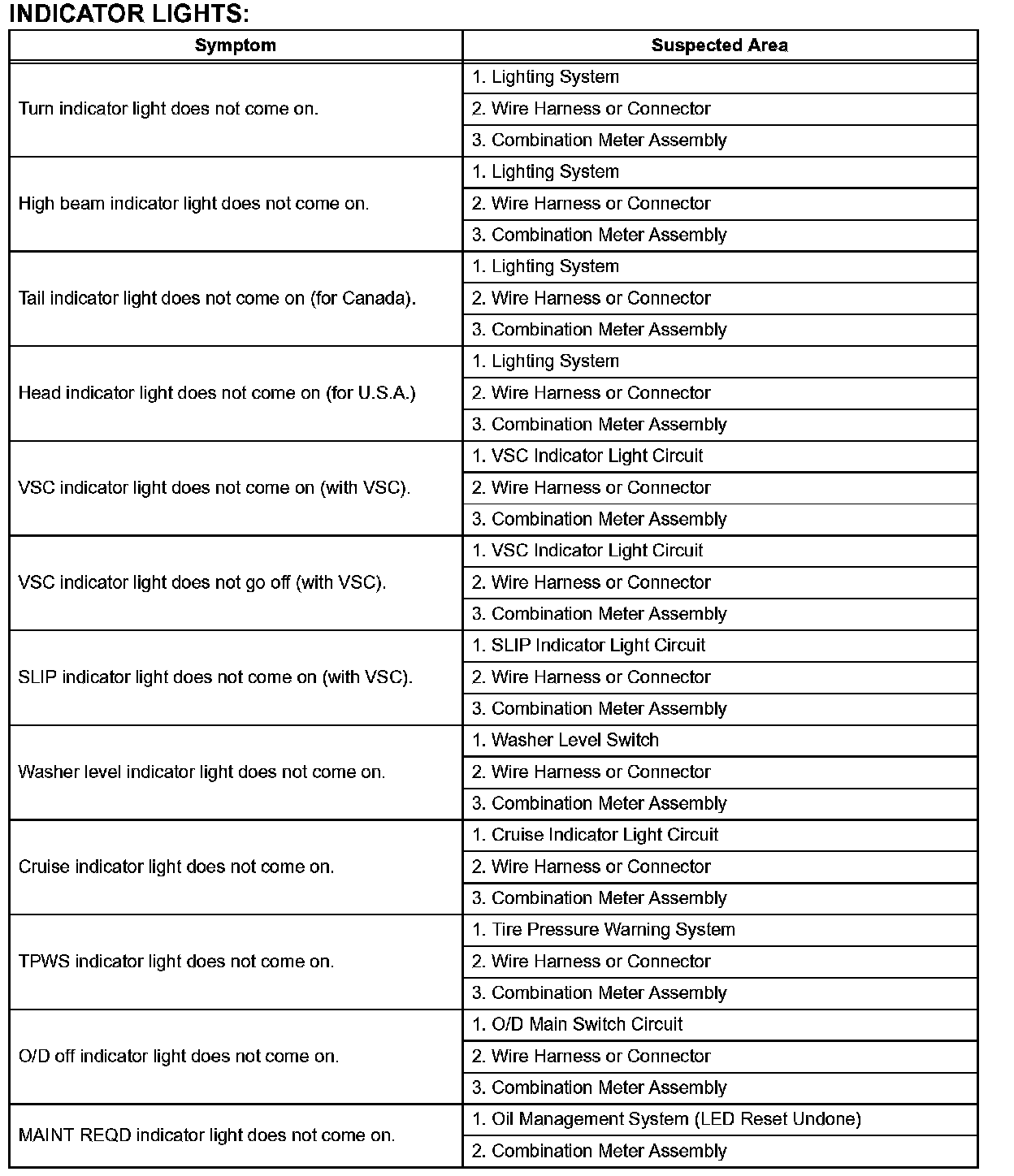Problem Symptoms Table-Indicator Lights: