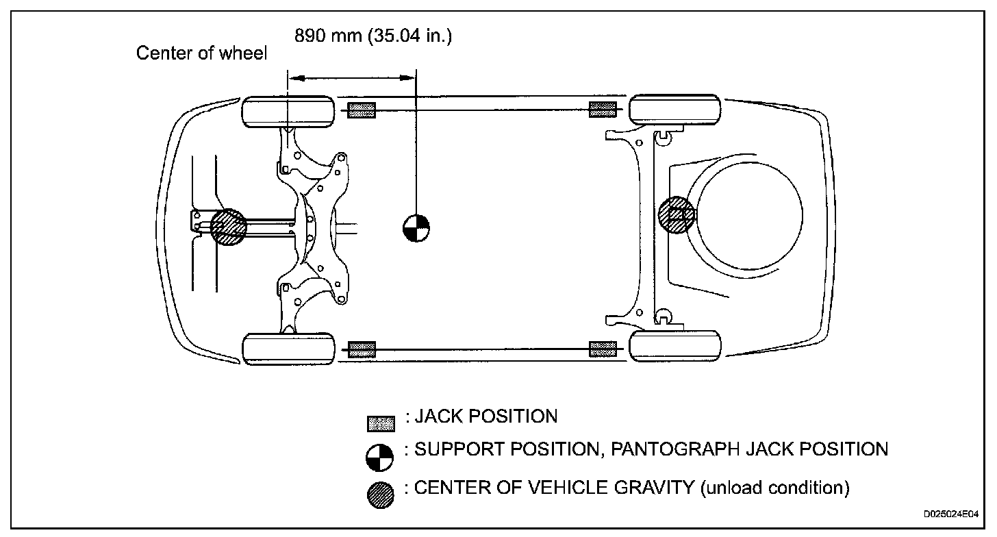 b. When removing any parts of heavy weight like the engine and transmission, the center of gravity of the vehicle moves. Place a balance weight so as to keep it from rolling, or hold the jacking support location using the mission jack.