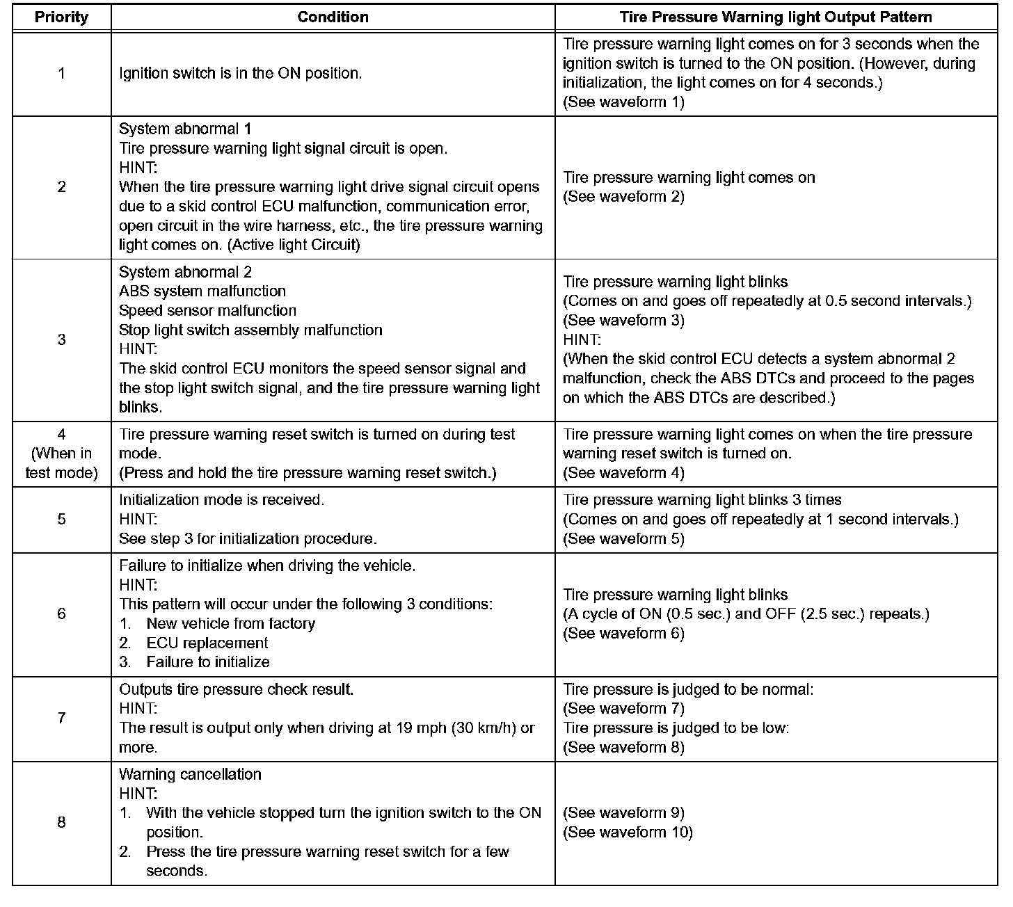 HINT: If the tire pressure warning light has a defect, check the tire pressure warning light output patterns and the problem symptoms table. Symptom Related Diagnostic Procedures