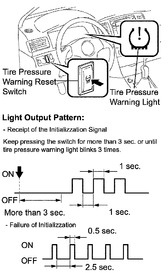 HINT: If the tire pressure warning light repeats a cycle of ON (0.5 seconds) and OFF (2.5 seconds) while the vehicle is being driven, initialization may have failed. If so, perform the initialization again. (Turn the ignition switch off and retry from step [A].)