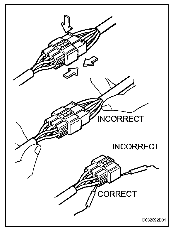 5. If checking a connector with a TOYOTA electrical tester, check the connector from the backside (harness side) using a mini test lead.