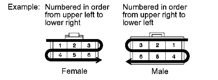 [K] : Indicates the pin number of the connector. The numbering system is different for female and male connectors.