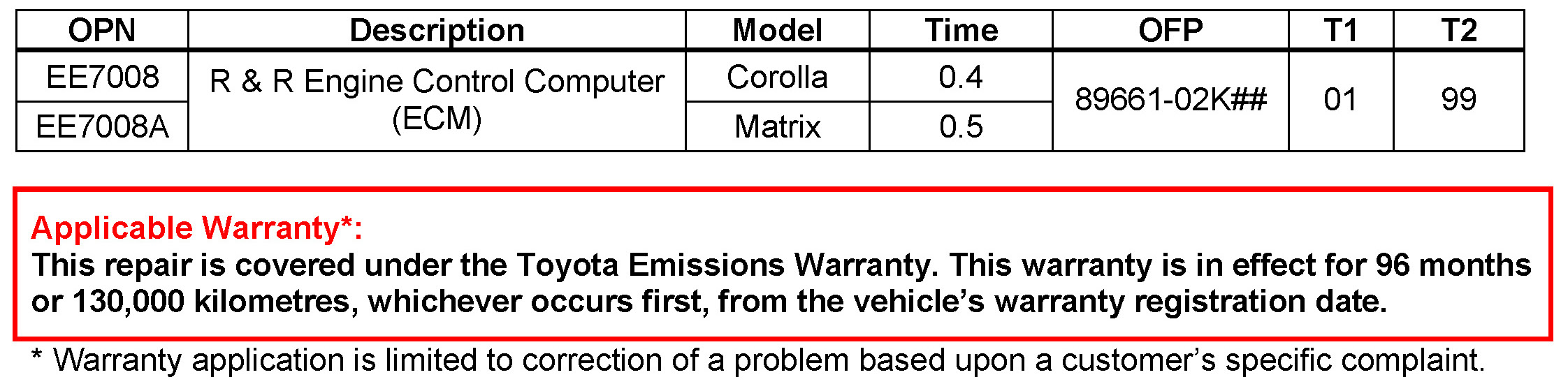 Some 2007 model year Corolla and Matrix vehicles equipped with a 1ZZ-FE engine may exhibit a "no start" condition. Improvements have been made to the Engine Control Module (ECM) (SAE term: Powertrain Control Module/PCM) manufacturing process to reduce the possibility of this condition occurring. Please use the following procedure to repair the vehicle.