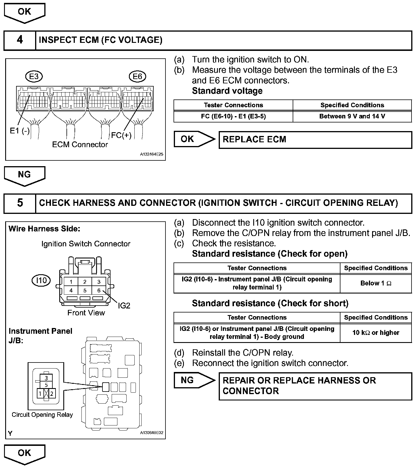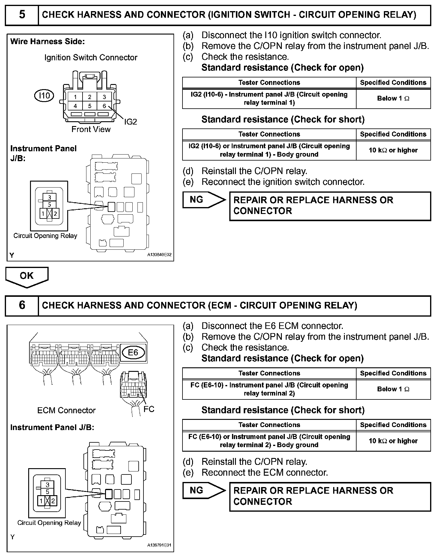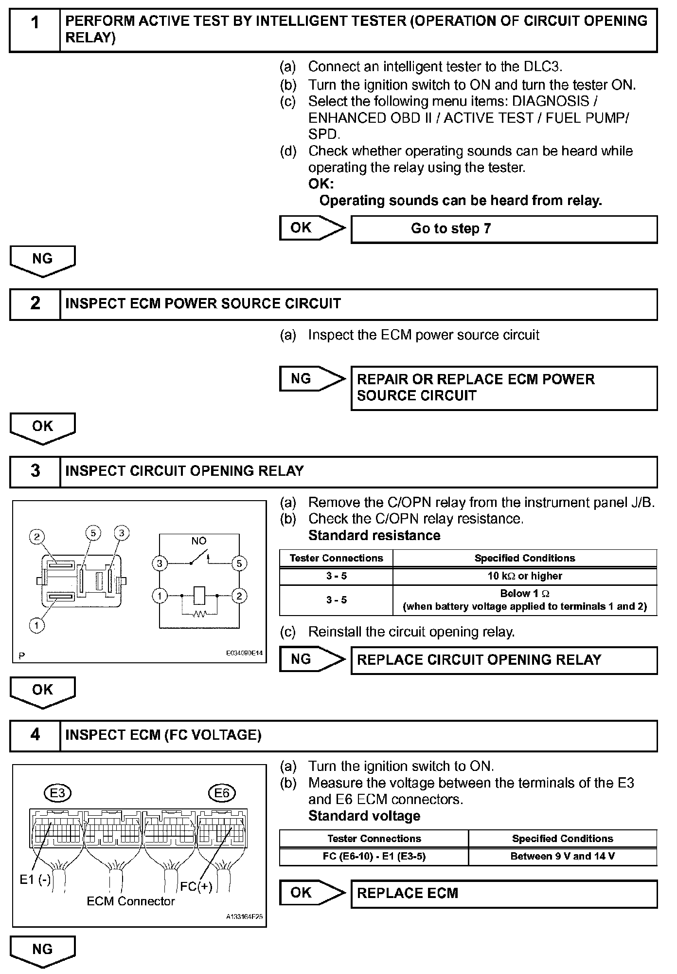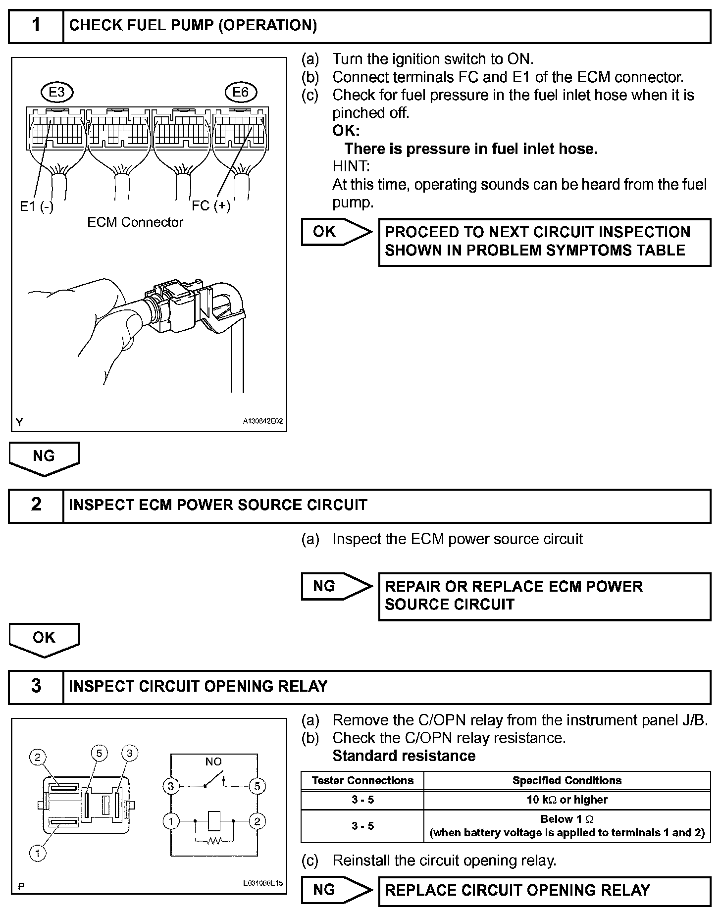 When the STA and NE signals are received by the ECM, Tr (power transistor) is switched on, allowing current to flow into the circuit opening relay coil. The circuit opening relay switches on, power is supplied to the fuel pump and the fuel pump operates.