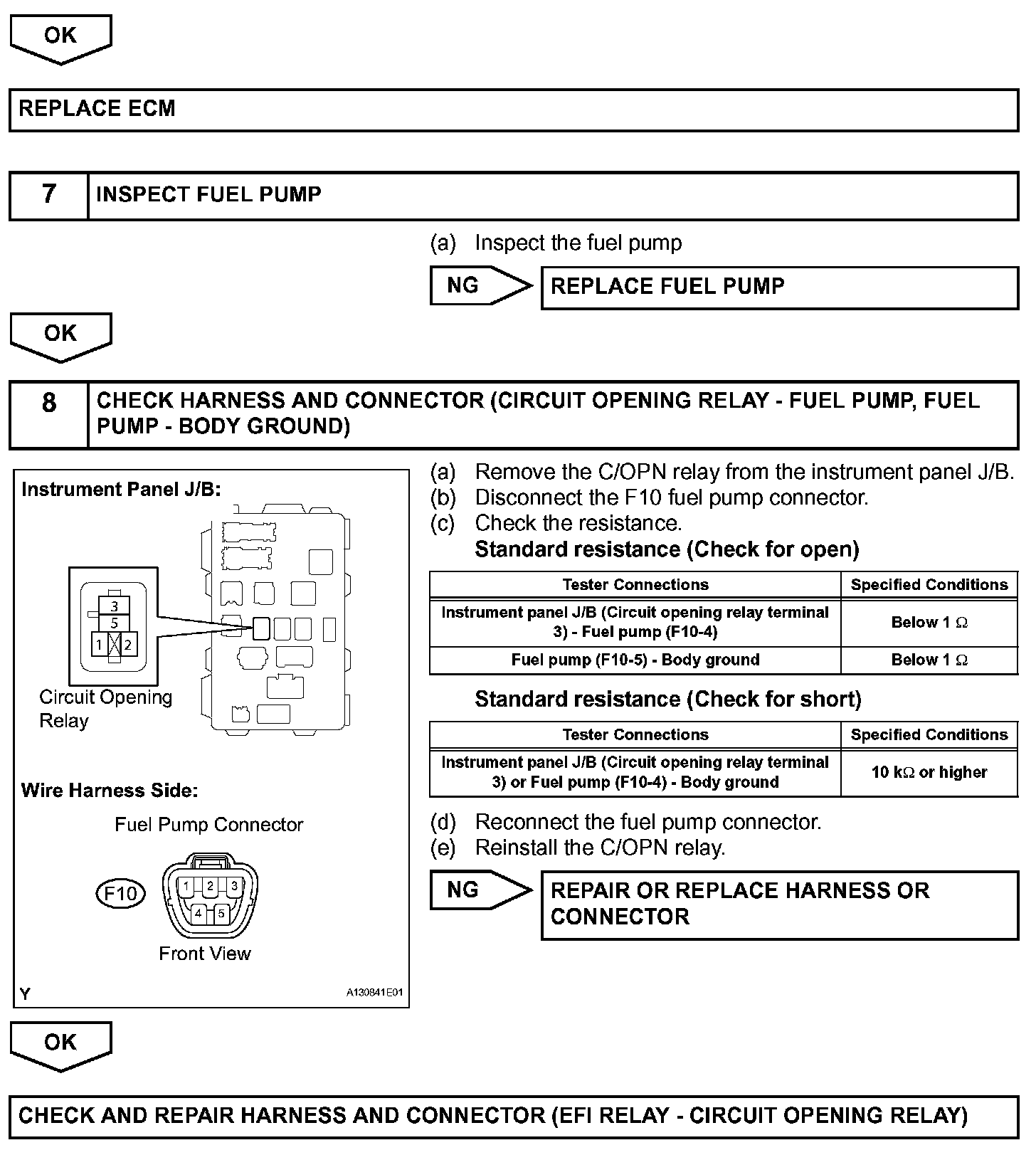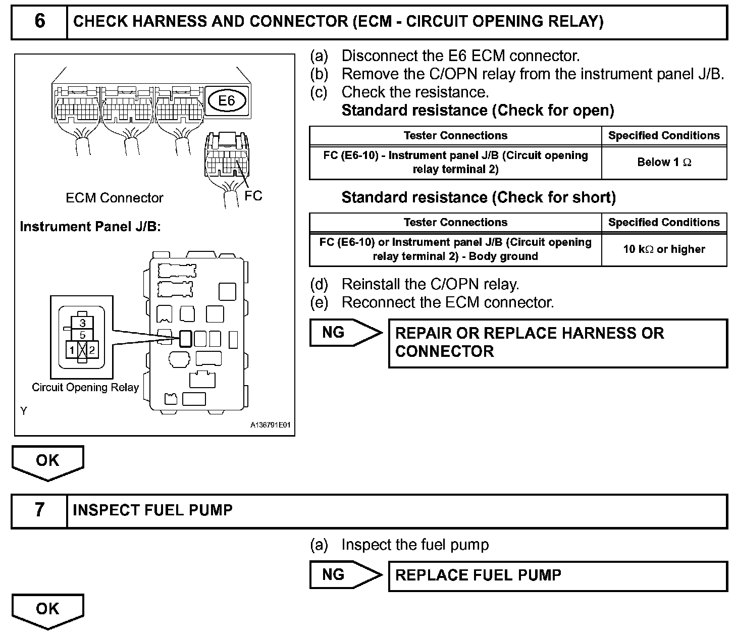 While the NE signal is being generated (engine running), the ECM keeps Tr ON, therefore keeping the circuit opening relay ON, so that the fuel pump continues to operate.