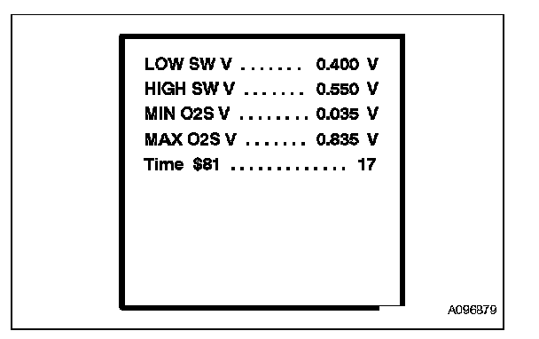 NOTE: Until the HO2 sensor monitor runs to completion, when it fails to complete or when the ignition switch is turned to OFF, the tester screen displays the upper and lower viewable limit values for the monitor (for example, voltages: 0 V and 1.275 V, seconds: 0 and 10.2, and Test Value: 0 and 255).