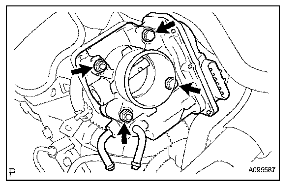 d. Remove the 2 bolts and 2 nuts, then remove the throttle body.