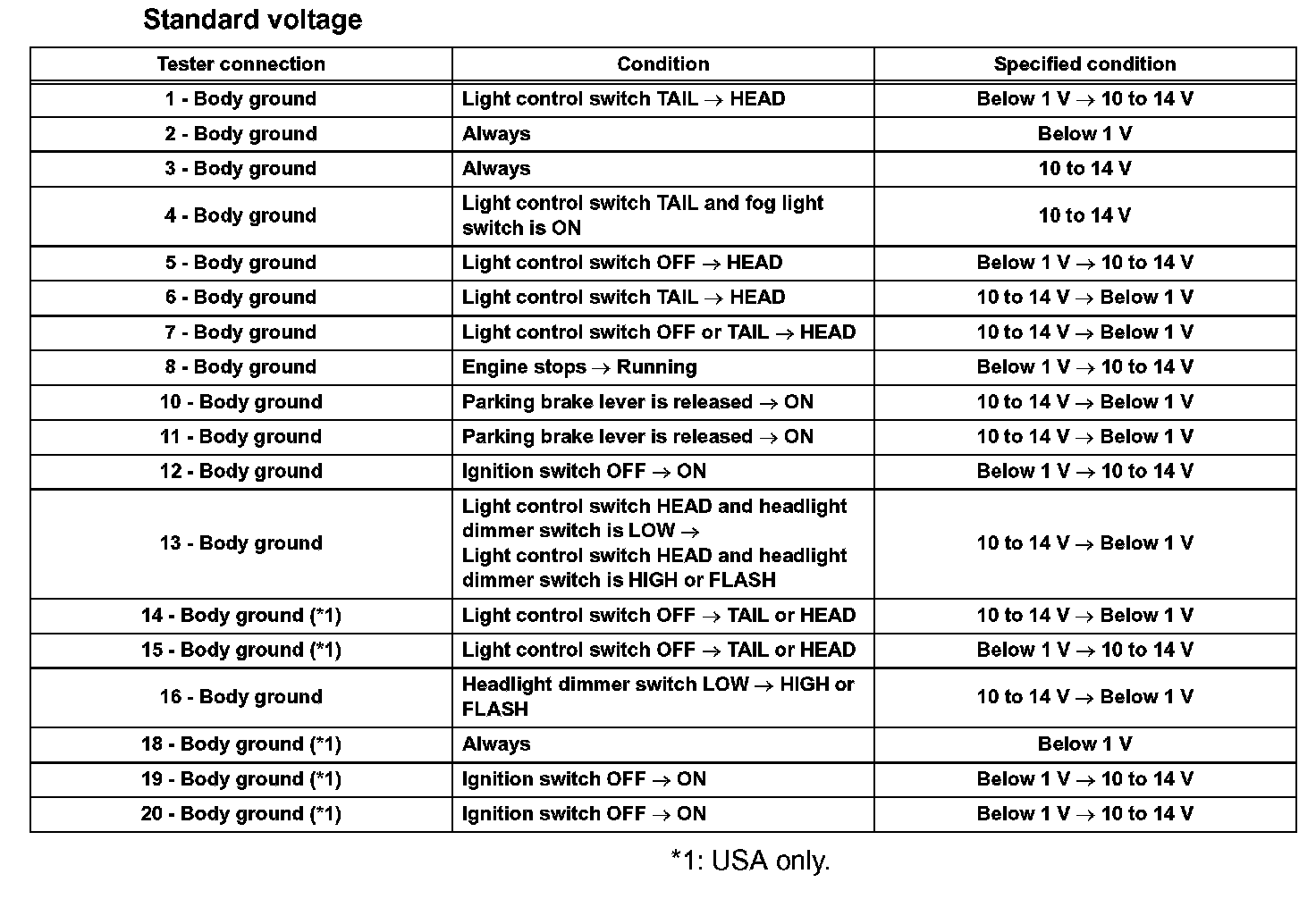 Connect the connector to the daytime running light relay and inspect the wire harness side connector from the back side as shown in the table.