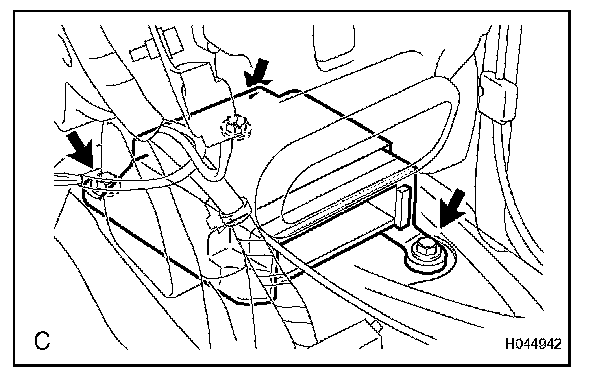 - When installing the center airbag sensor assembly, be careful that the SRS wiring does not interfere with other parts and that it is not pinched between other parts.