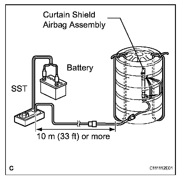 - When deploying the airbag, perform the operation at least 10 m (33 ft) away from the curtain shield airbag assembly.