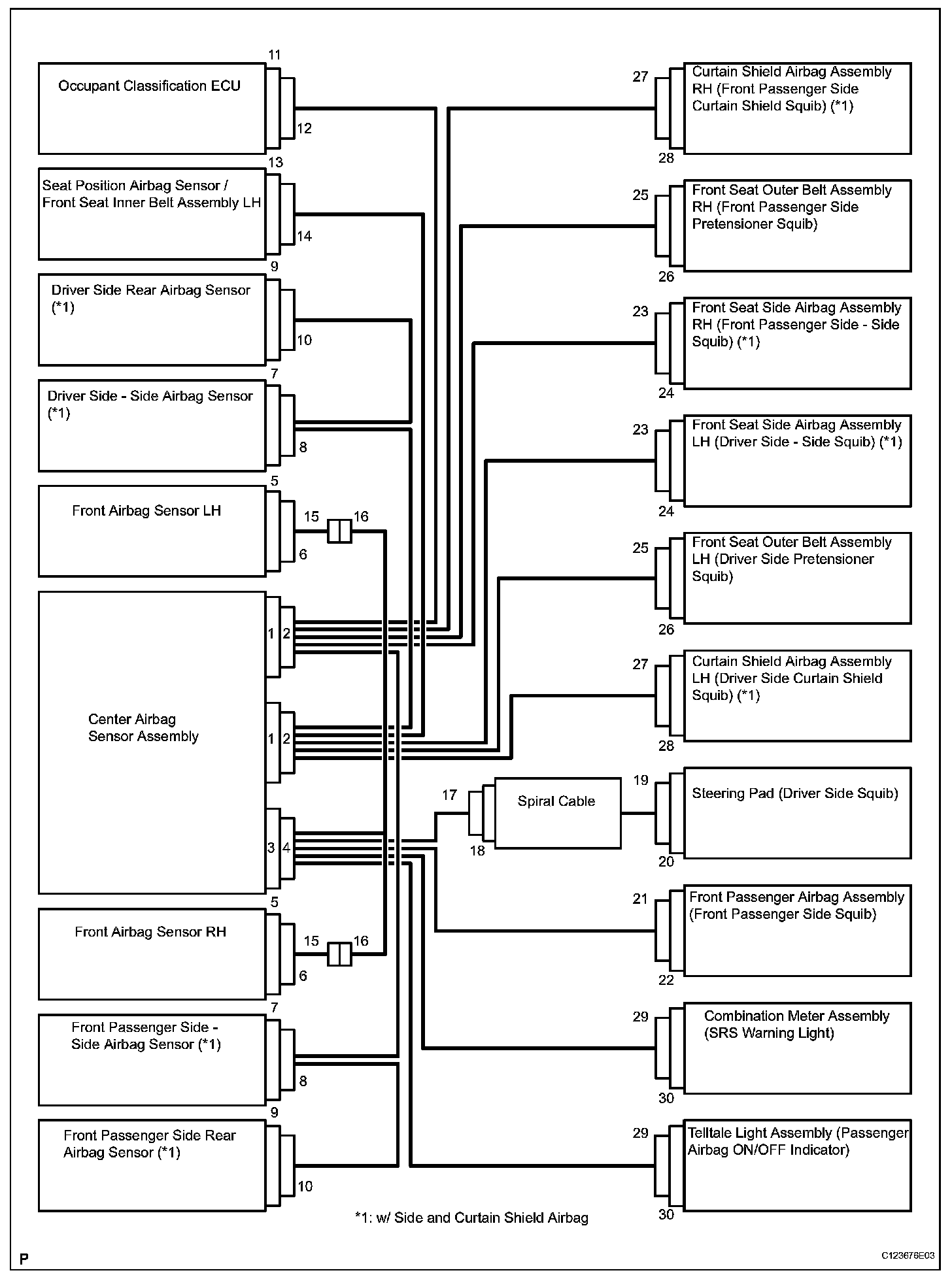 - Even in the case of a minor collision when the SRS does not deploy, the steering pad, front passenger airbag assembly, center airbag sensor assembly, front airbag sensor, front seat inner belt assembly, seat position airbag sensor, occupant classification ECU, front seat side airbag assembly, side airbag sensor, curtain shield airbag assembly, rear airbag sensor or front seat outer belt assembly should be inspected.