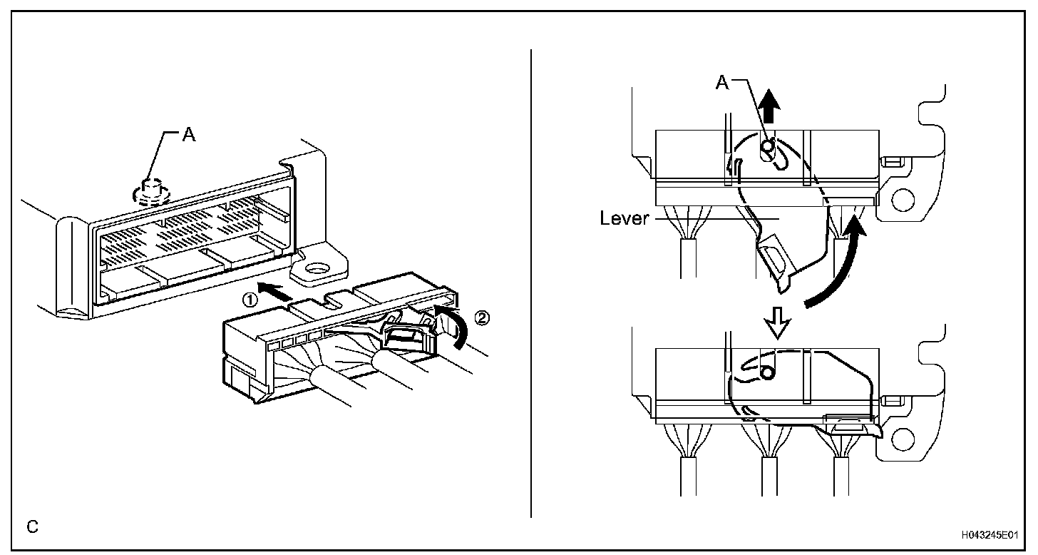 a. Pull the lever by pushing part A as shown in the illustration and disconnect the holder (with connectors).