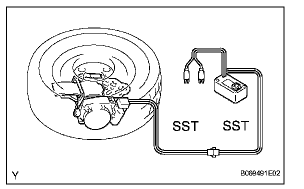 1. Connect 2 SST, and then connect them to the front seat outer belt pretensioner.