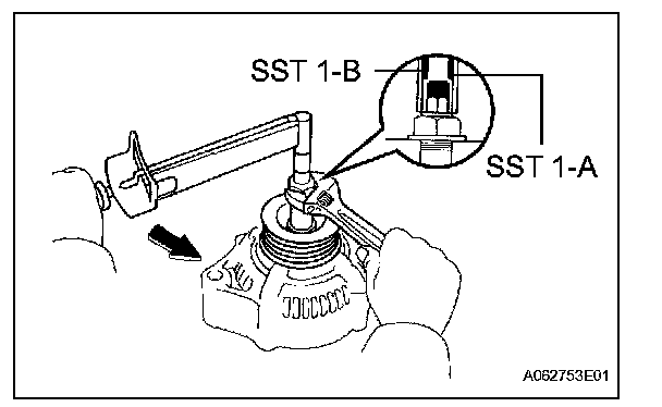 b. Hold SST 1-A with a torque wrench, then tighten SST 1-B counterclockwise to the specified torque.