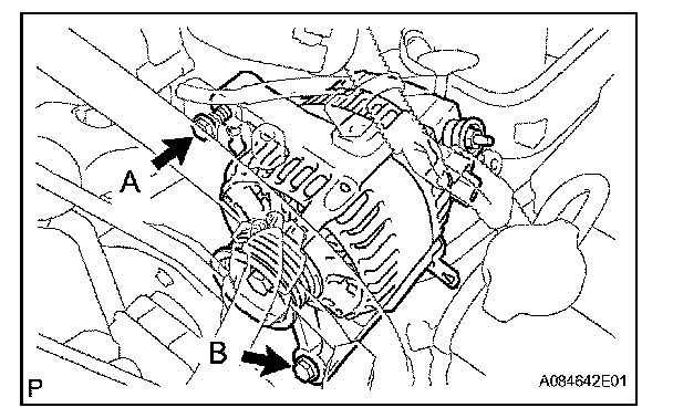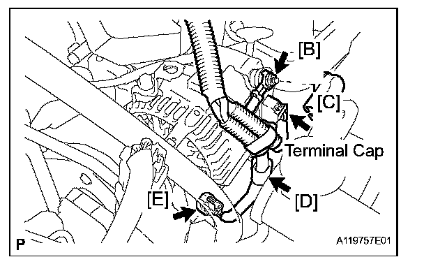 b. Remove the nut [B], then remove the generator wire.