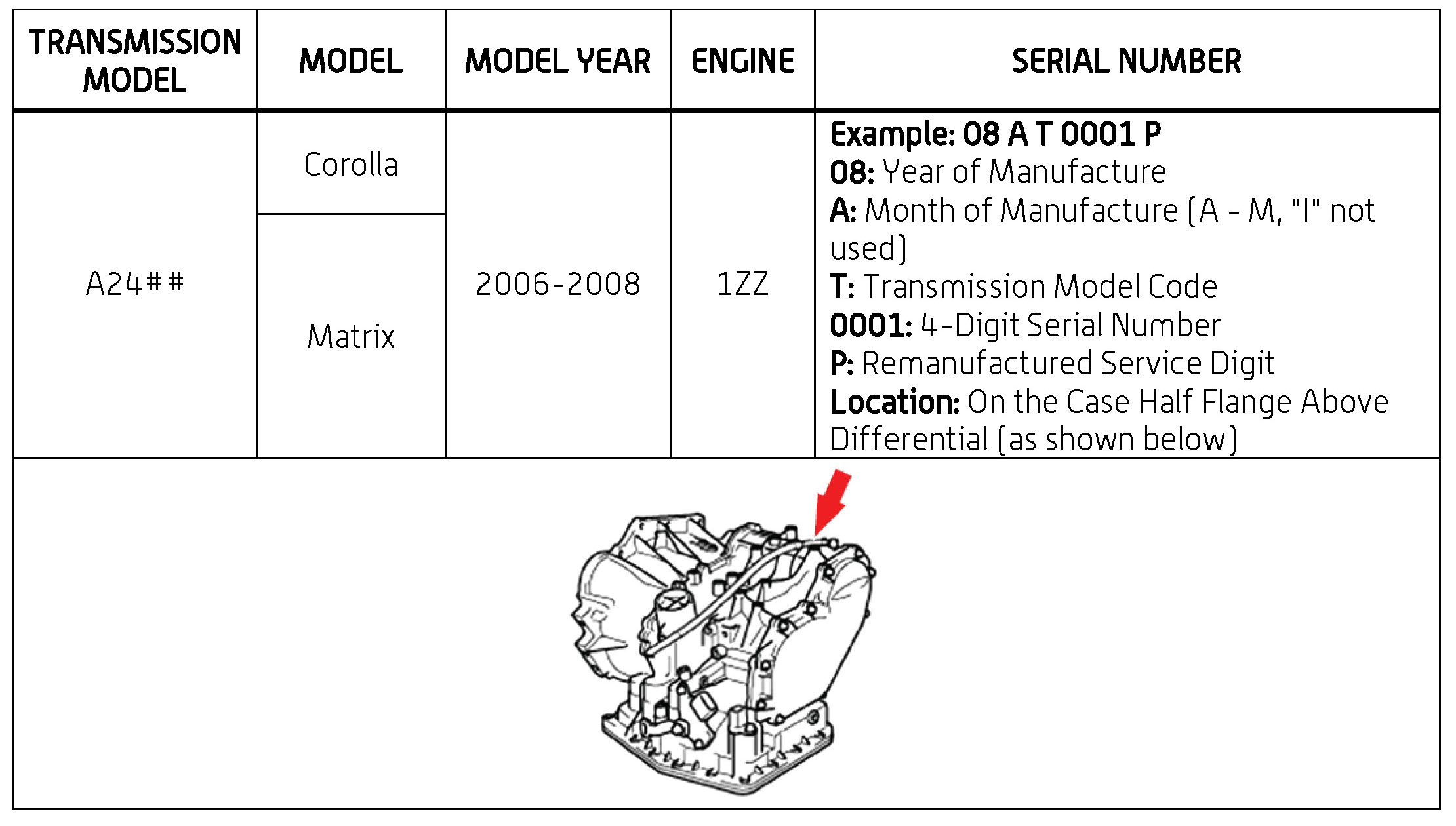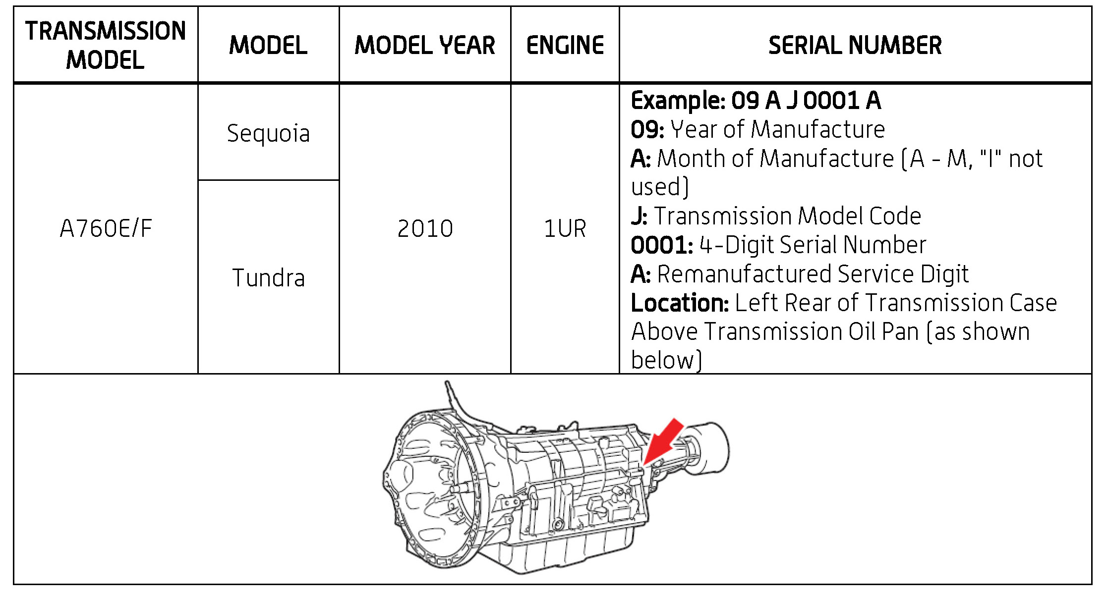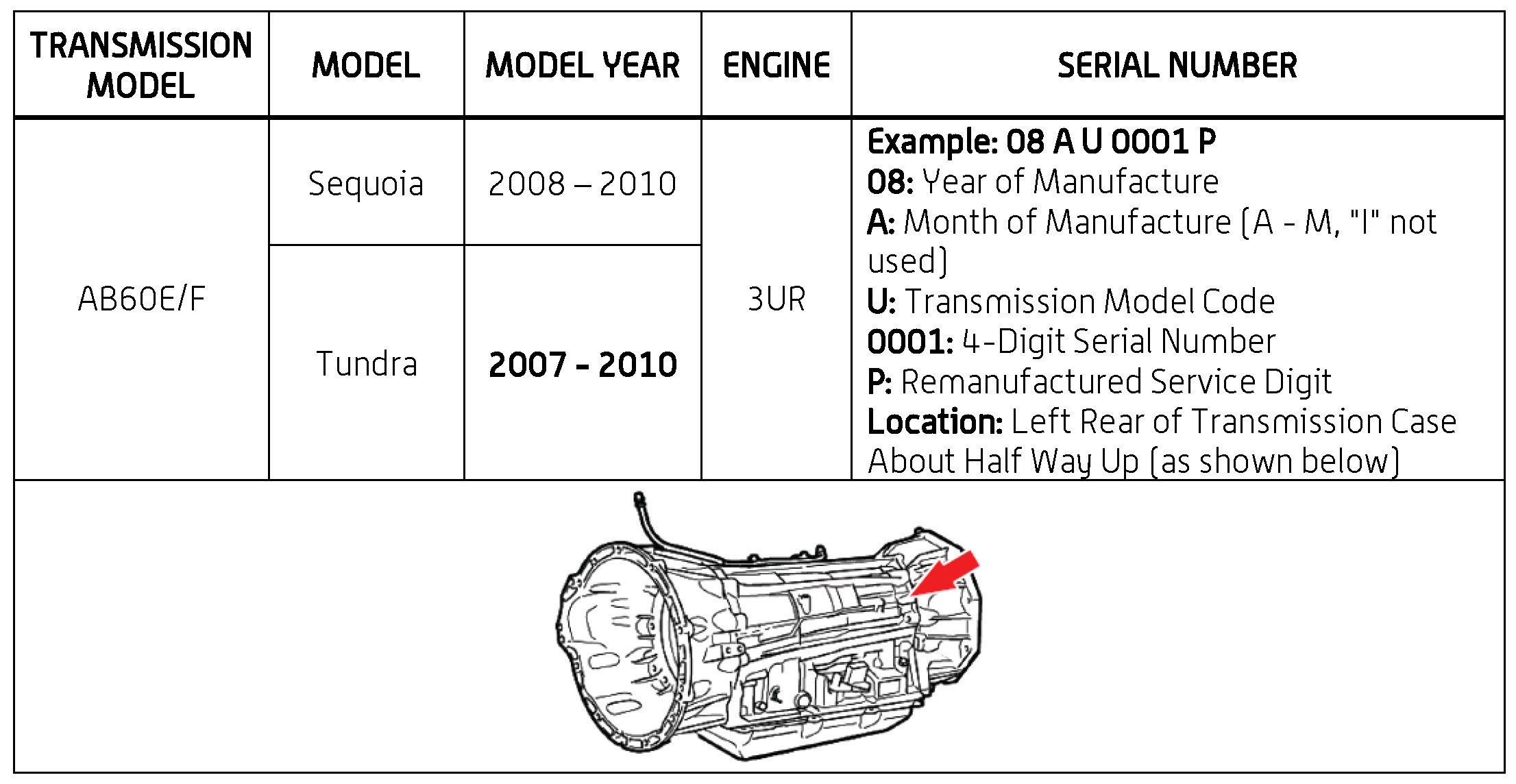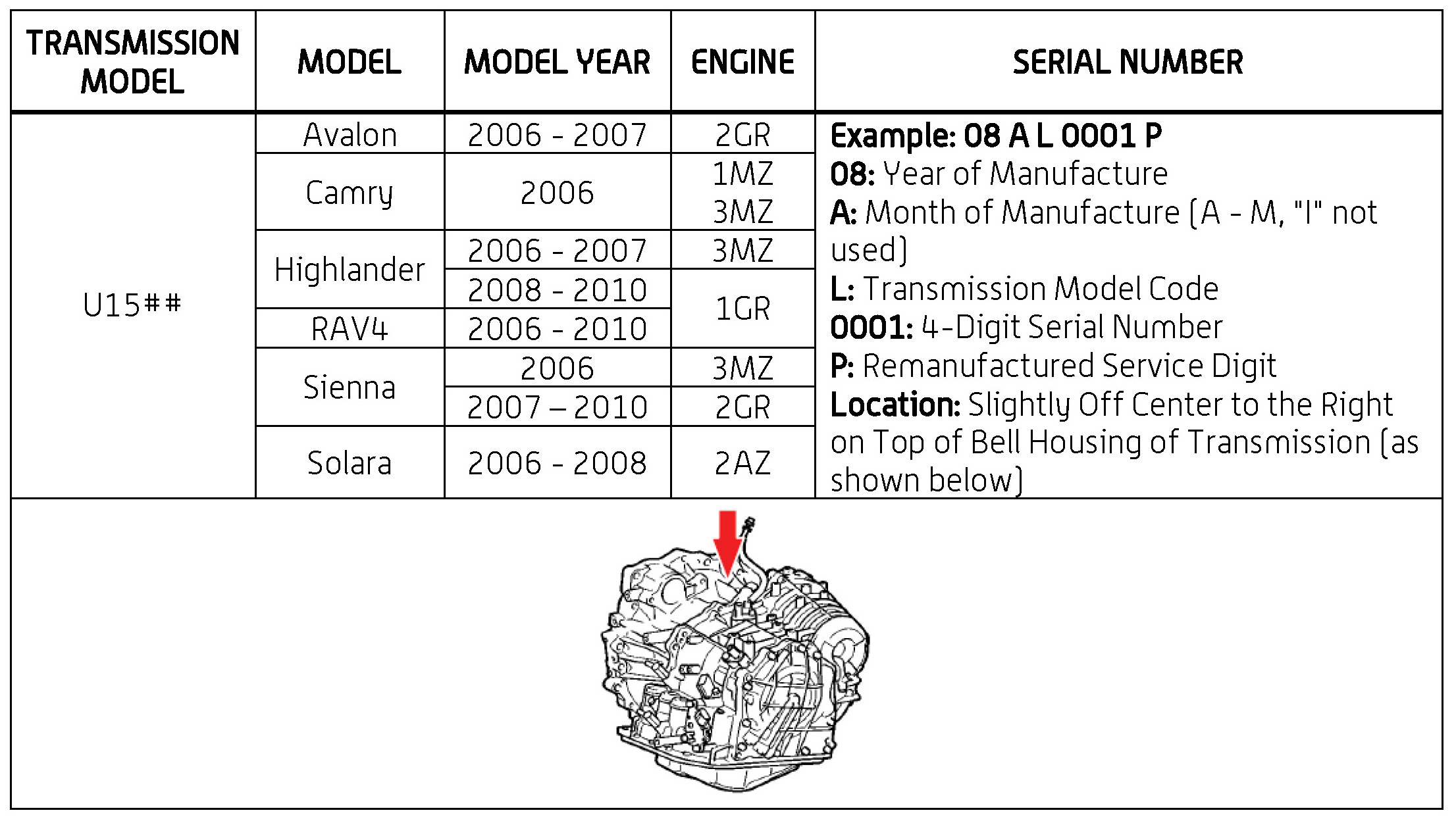 The purpose of this TSB is to assist in the identification and location of serial numbers on 2006 - 2010 model year remanufactured automatic transmissions.