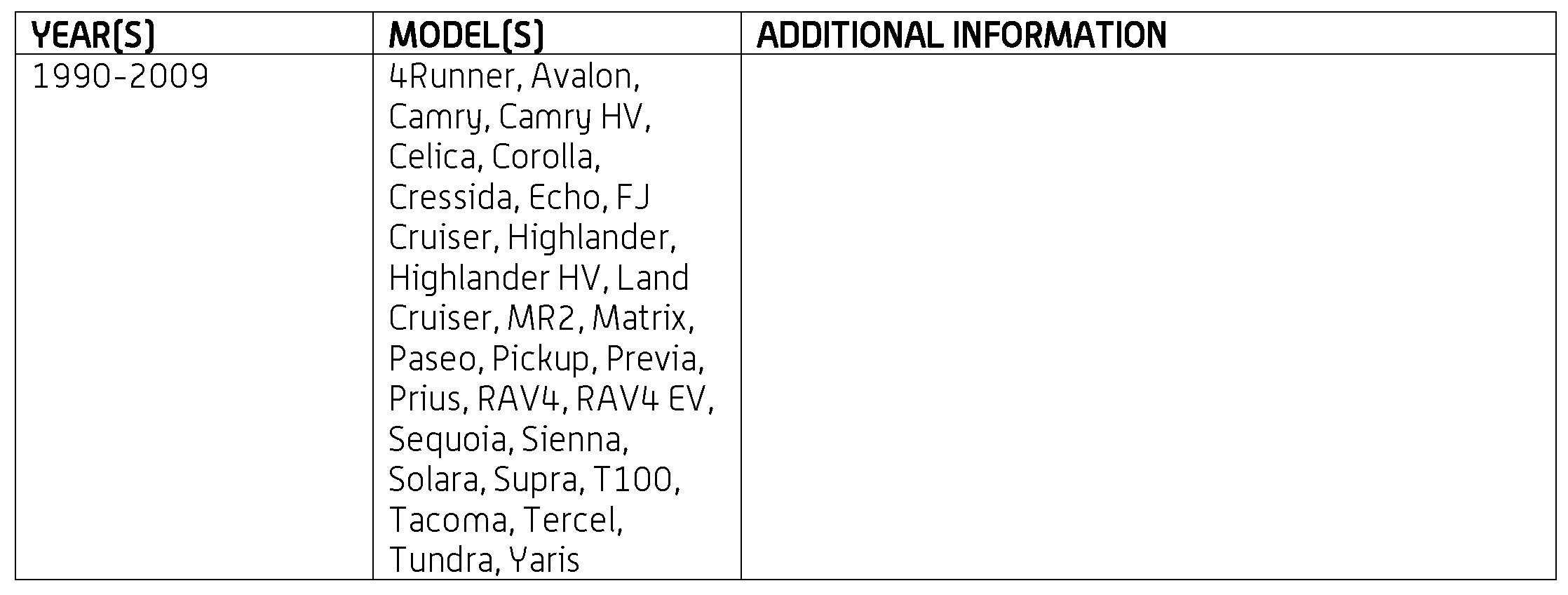 '90-'09 All applicable Toyota models
