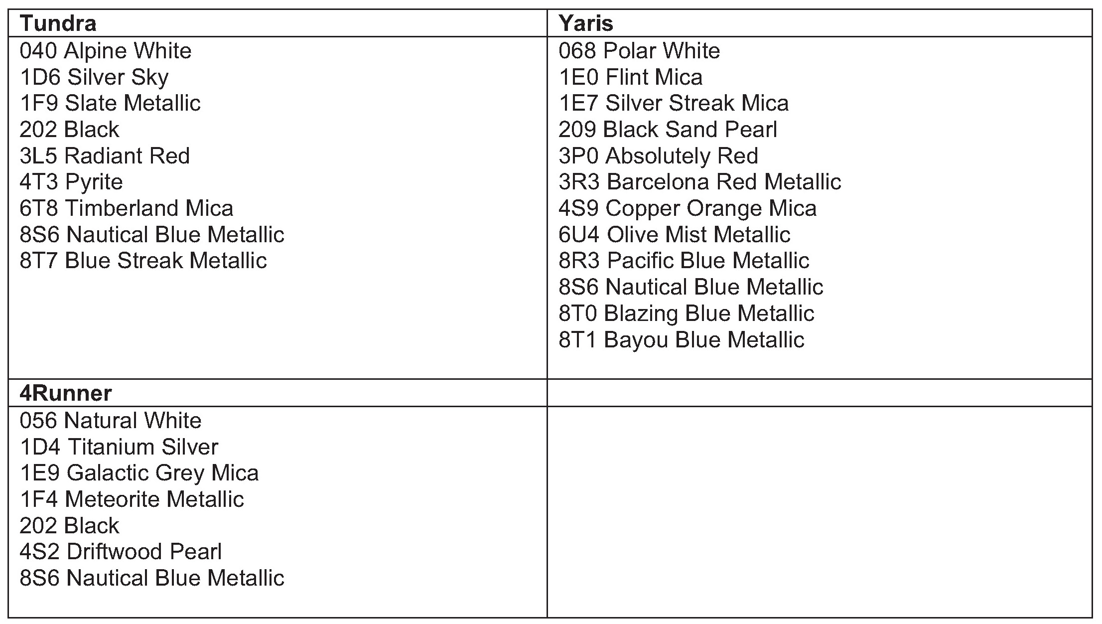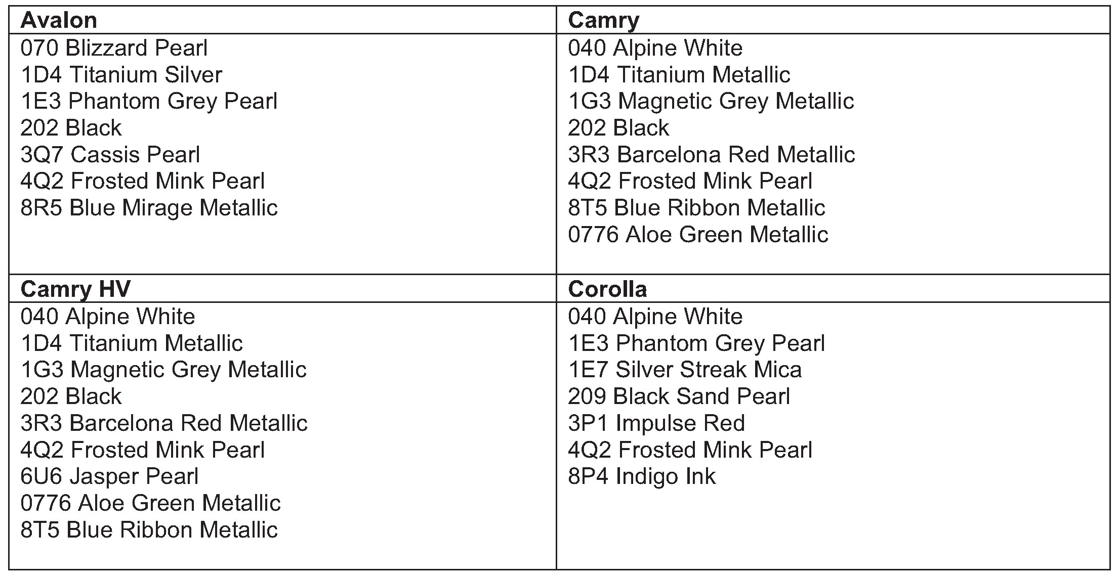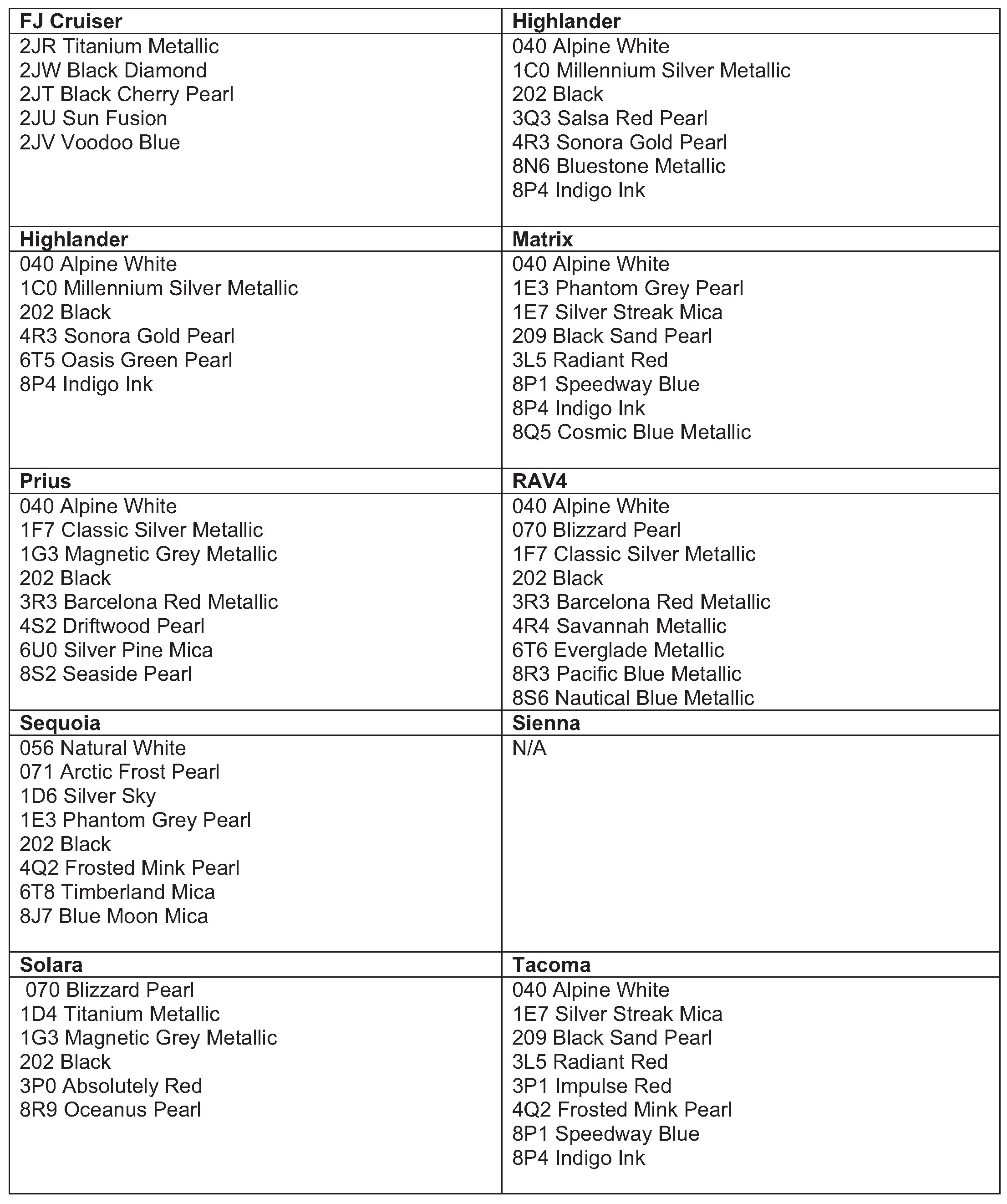 The following information outlines exterior body colour codes used on the 2007 Model Year vehicles.