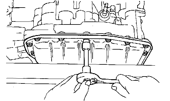 NOTICE: Do not turn the transaxle over as it will contaminate the valve body with the foreign materials from the bottom of the pan.