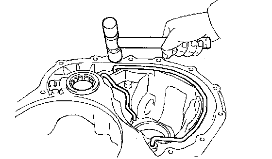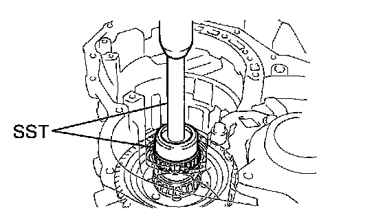 (c) Using SST and a press, press a new front drive pinion front tapered roller bearing outer race in to the transaxle housing.