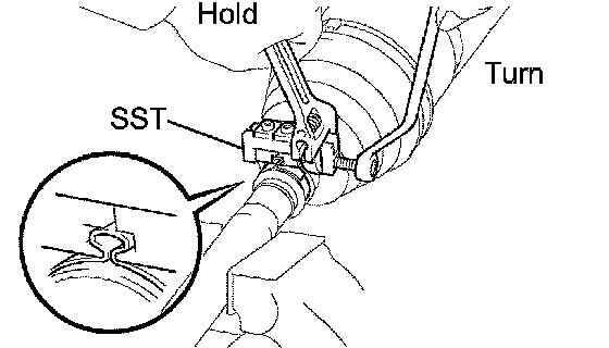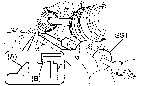 HINT: In case of not being able to remove the drive shaft at the position of the illustration (A), hook the claw of SST to the position of the illustration (B), remove it.