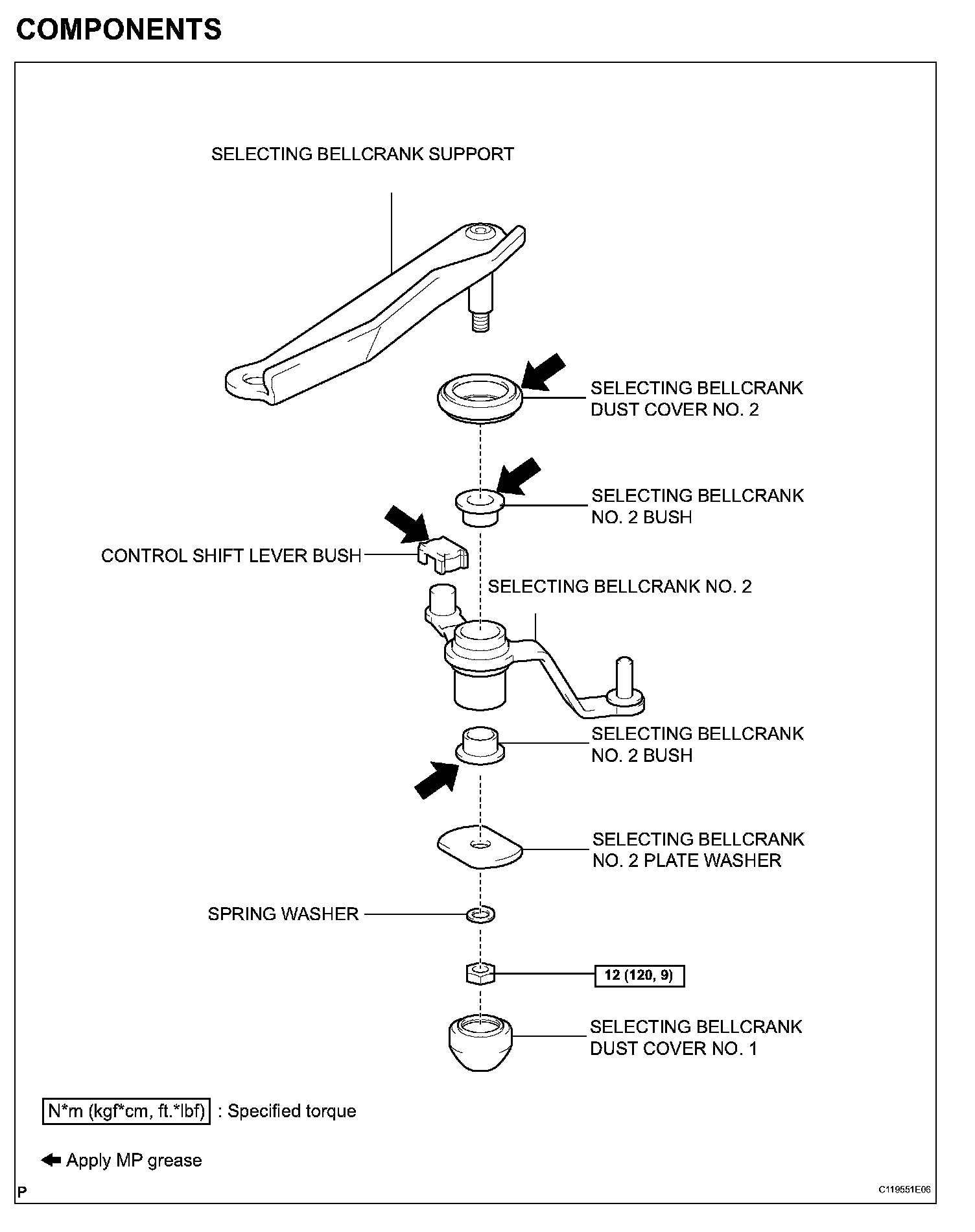 (a) Coat the control shift lever bush with MP grease, install it to the selecting bellcrank assembly.