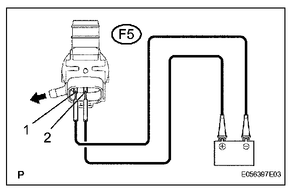 2. Connect the battery (+) to terminal 2 of the windshield washer motor and pump assembly, the battery (-) to terminal 1 of the windshield washer motor and pump assembly. Check that the water comes out from the washer jar.