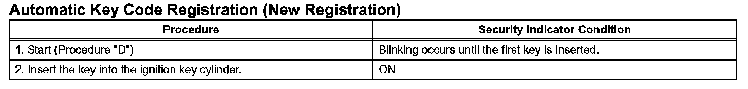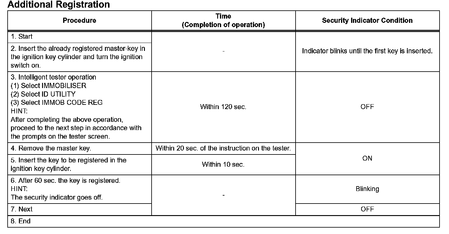 HINT: The key has 2 codes: The key code (Immobilizer code) and the wireless code. Both of these codes need to be registered. Refer the wireless code registration procedures.