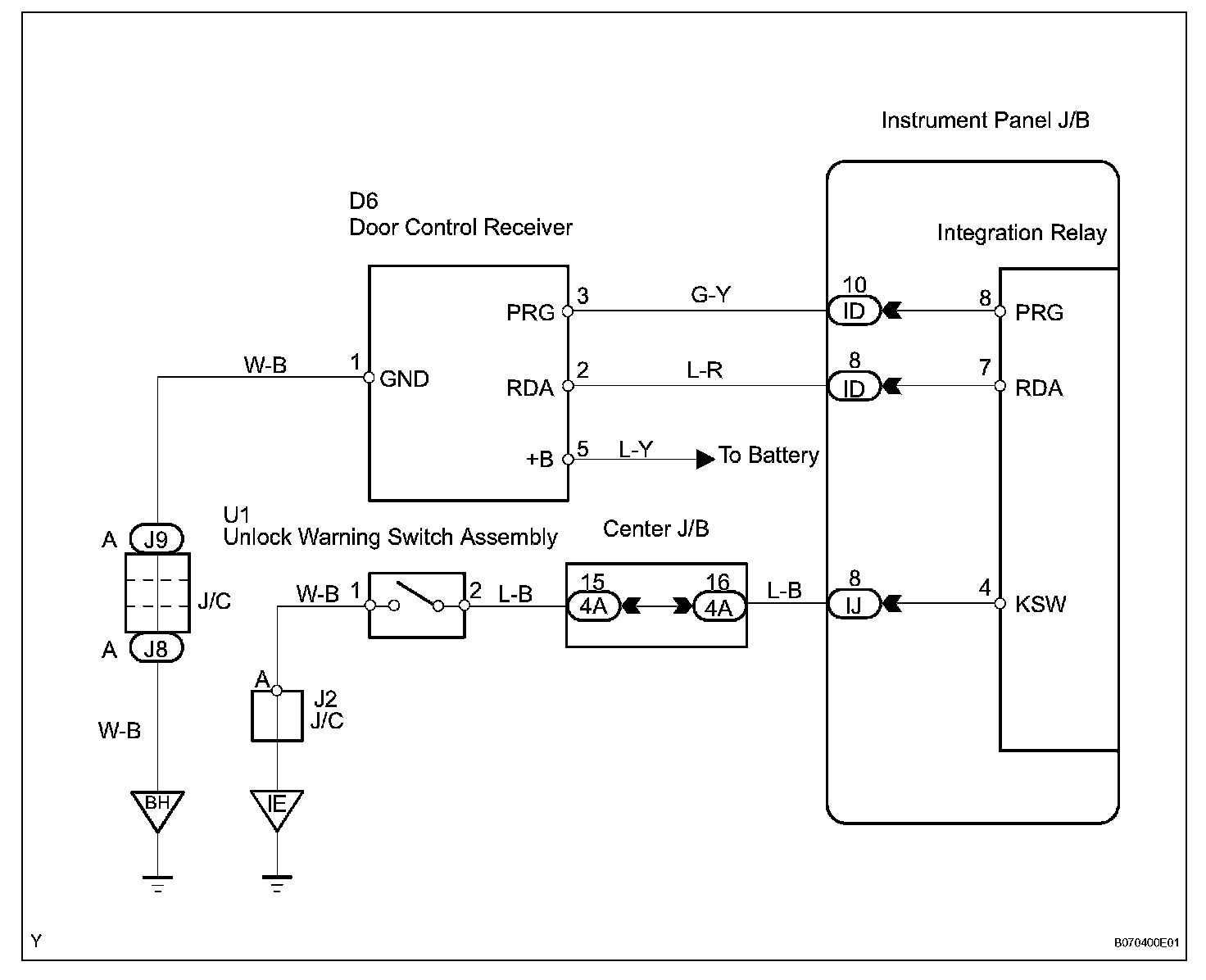 The door control receiver receives a signal from the transmitter and sends this signal to the integration relay. Then, the integration relay controls door operation by sending a door LOCK/UNLOCK signal to each door lock motor.
