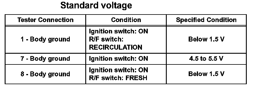 1. Disconnect the connector from the defroster mode switch and inspect the wire harness side, as shown in the chart.